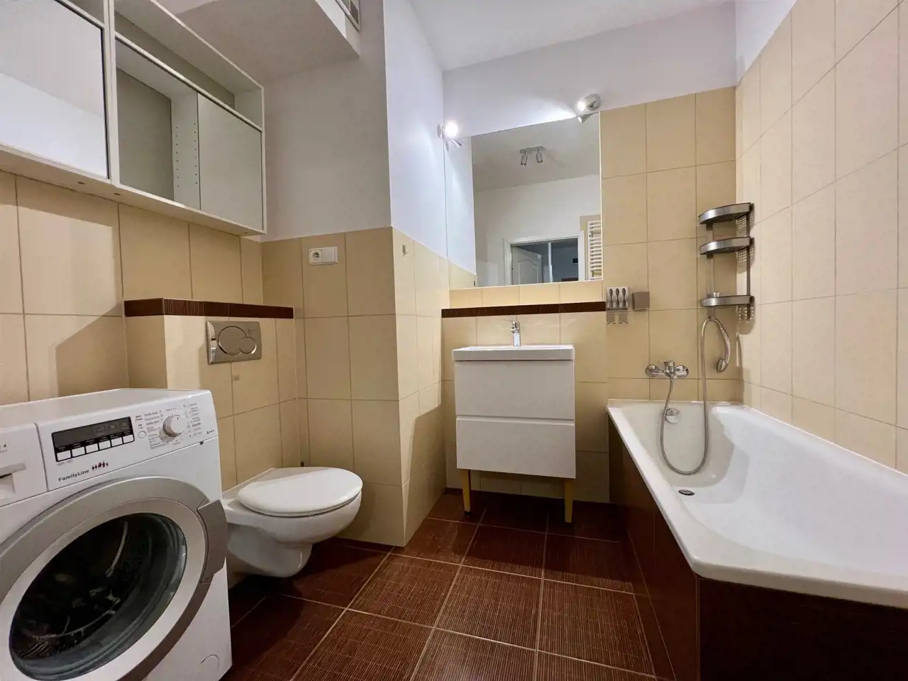Mieszanie posiada klimatyzacje, kompletnie wyposażoną kuchnie wraz ze sprzętem AGD (lodówka, zmywarka, zamrażarka, piekarnik, płyta grzewcza oraz łazienkę z wanną i pralką. W przedpokoju dużo miejsca do przechowywania. W sypialni duża szafa przesuwna na wymiar.