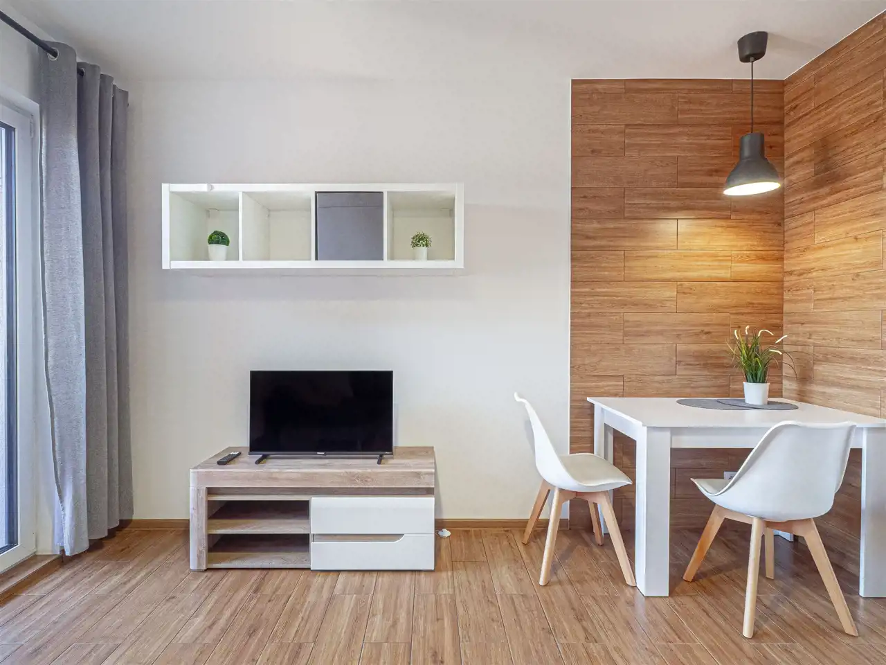 - salon wyposażony w rozkładaną sofę z funkcją spania, stół z krzesłami, stolik kawowy, półki, stolik telewizyjny wraz z TV oraz szafę ubraniową w zabudowie,