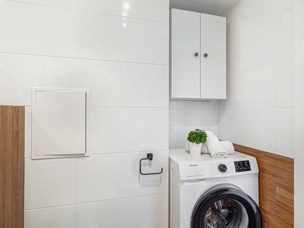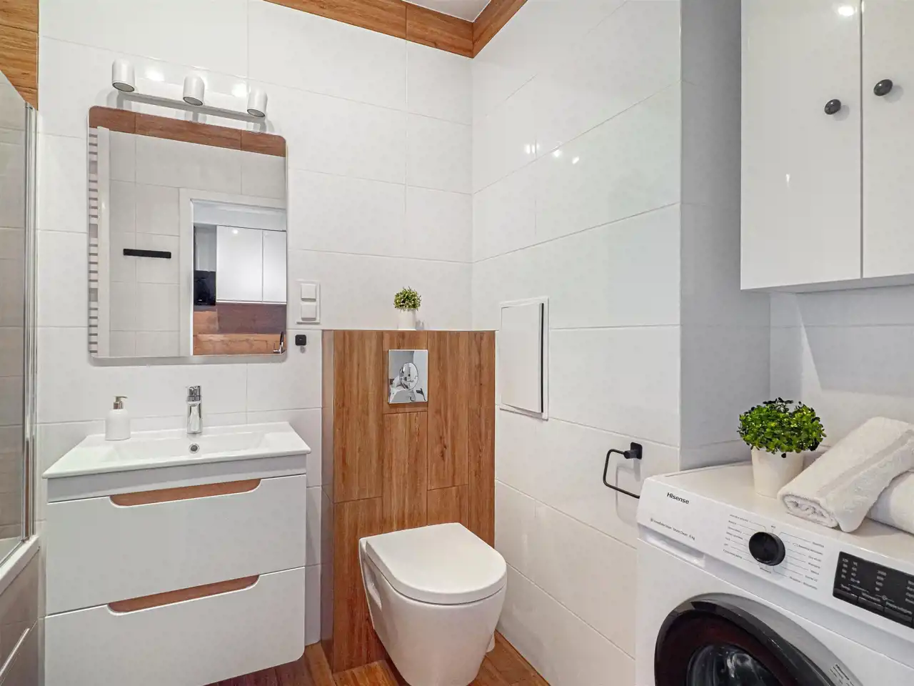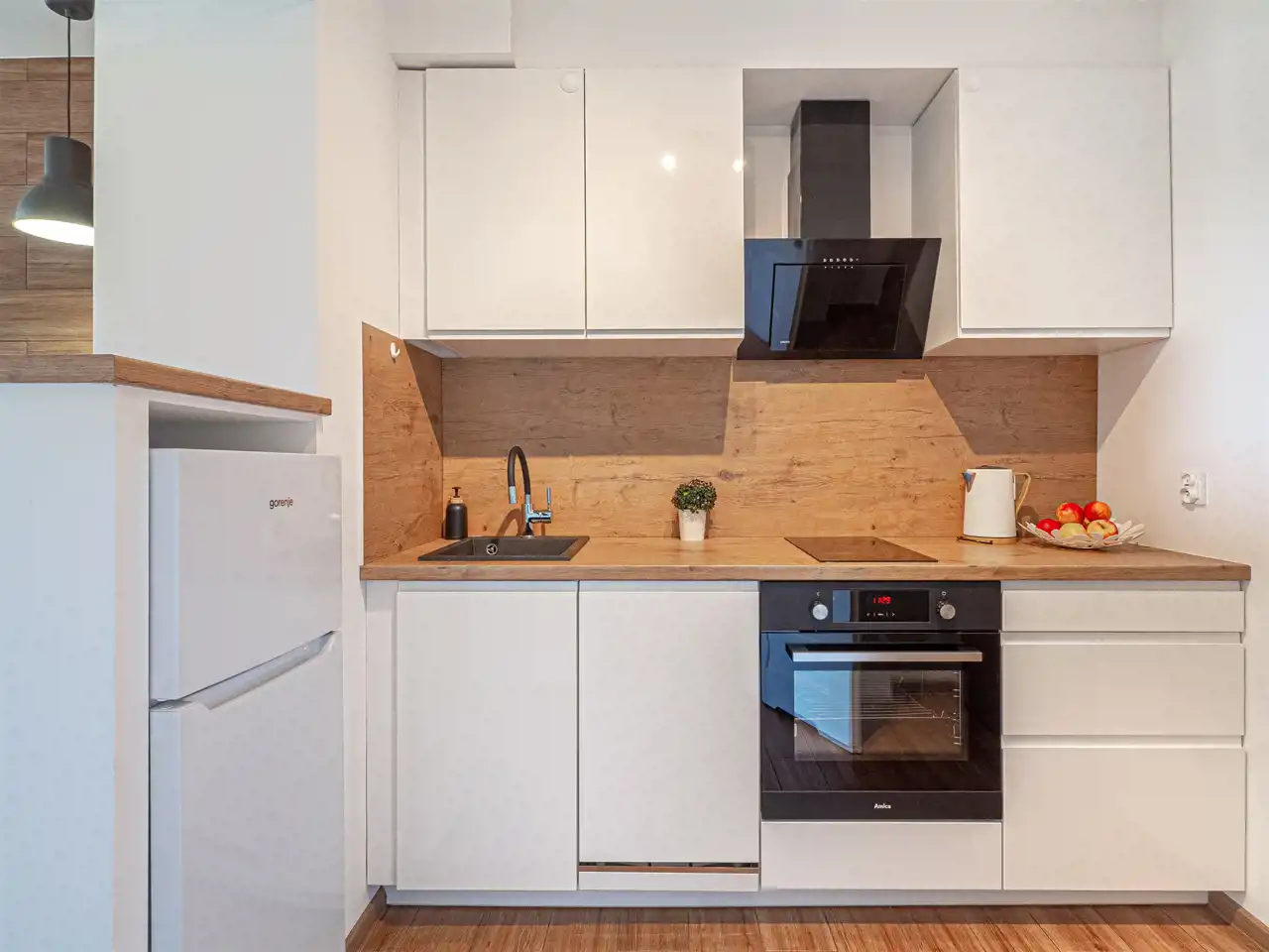 - kuchnia wyposażona w meble w zabudowie oraz sprzęt AGD (piekarnik, zmywarka, indukcyjna płyta grzewcza, lodówko-zamrażarka),