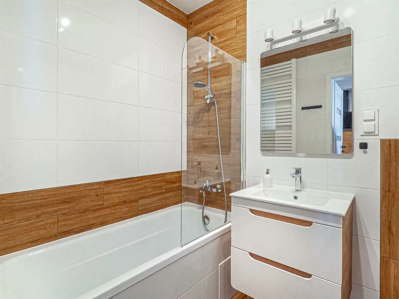 - a kitchen equipped with built-in furniture and household appliances (oven, dishwasher, induction hob, fridge-freezer),