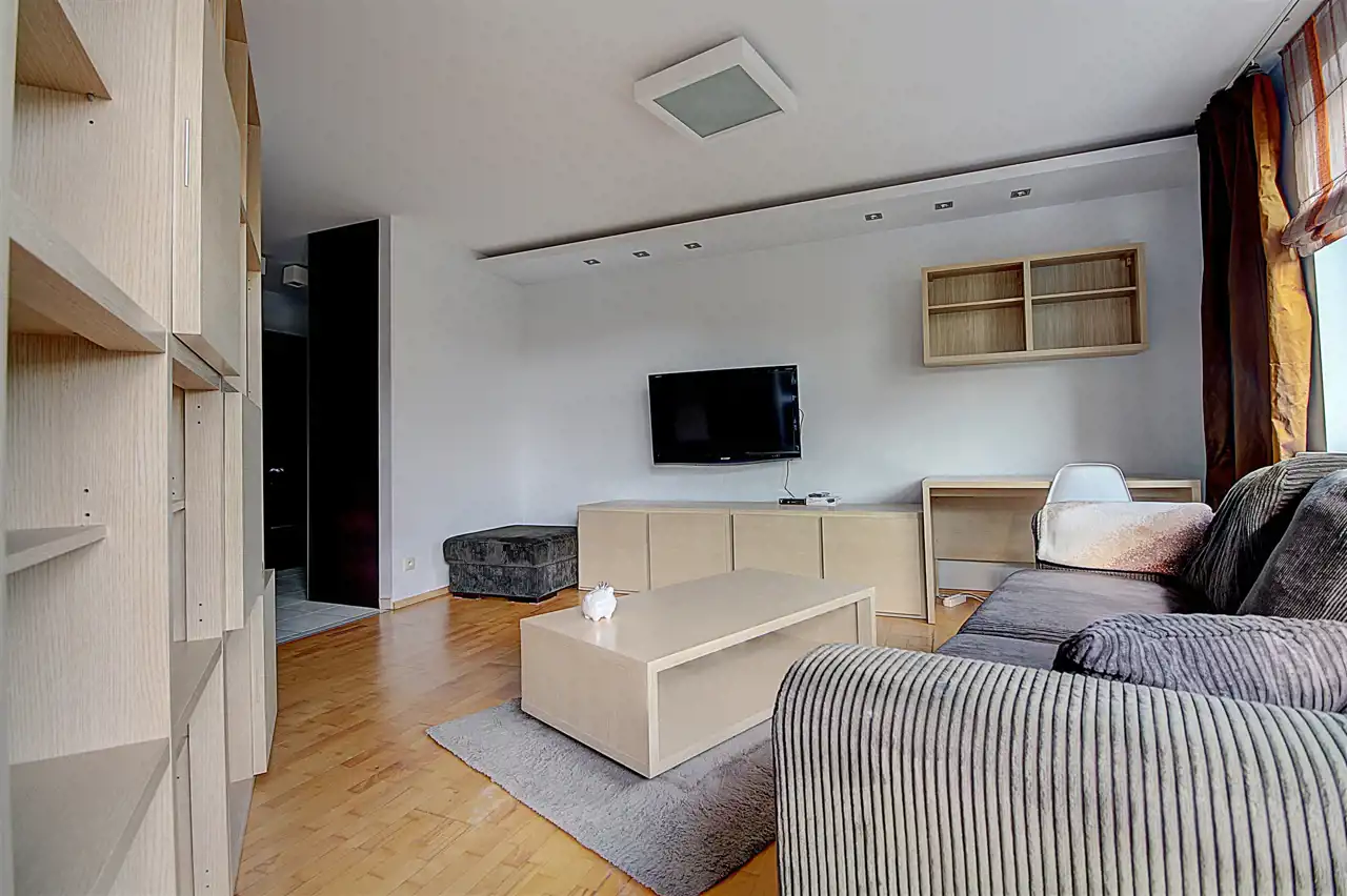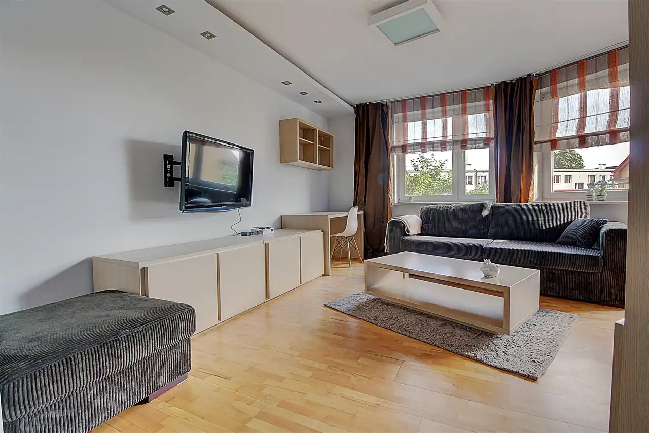 Składa się z salonu, podzielonego na część wypoczynkową i strefę pracy (z salonu też wyjście na duży balkon), dużej, widnej kuchni, łazienki i przedpokoju.