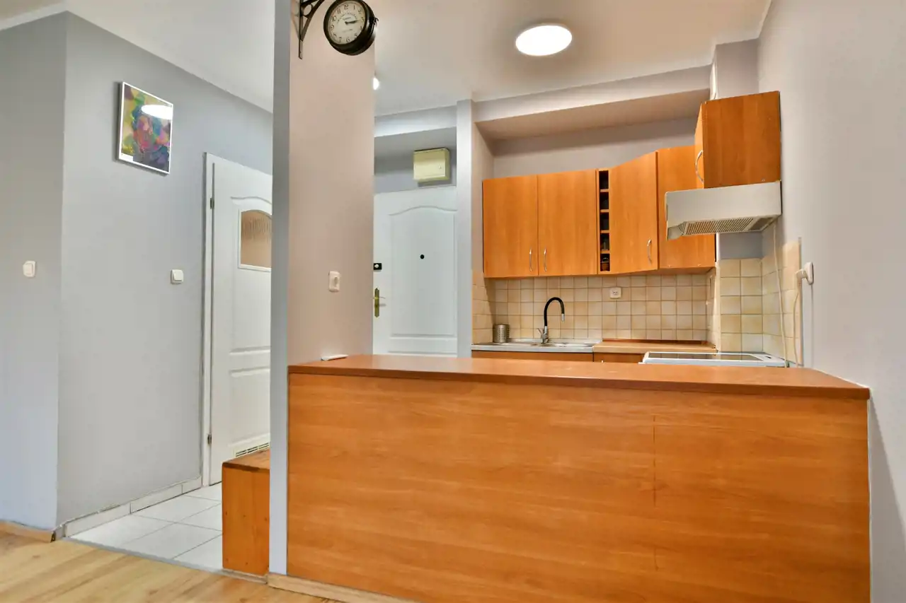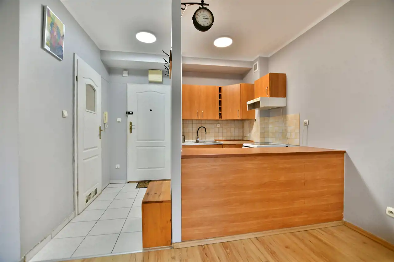 Mieszkanie bardzo ustawne o funkcjonalnym rozkładzie. Okna i drzwi balkonowe wychodzą na ogródki działkowe. Nie ma problemów z miejscami parkingowymi. Kuchnia w formie aneksu kuchennego wyposażona została w sprzęt AGD (lodówka, kuchenka elektryczna z piekarnikiem, okap) oraz lekko otwarta na salon w komfortowym rozmiarze. Duża ilość szafek i półeczek pozwala utrzymać porządek. Brama wjazdowa zamykana i otwierana na pilota. Oprócz tego domofon i wzmocnione drzwi.