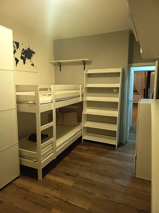 Pokój 2: wyposażenie obejmuje szafę, piętrowe łóżko, regały, podwieszane szafki, półki.