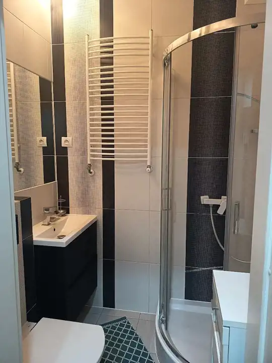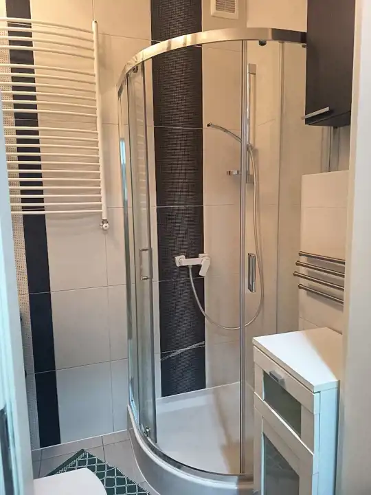 Łazienka: kabina prysznicowa, umywalka, toaleta, szafki.