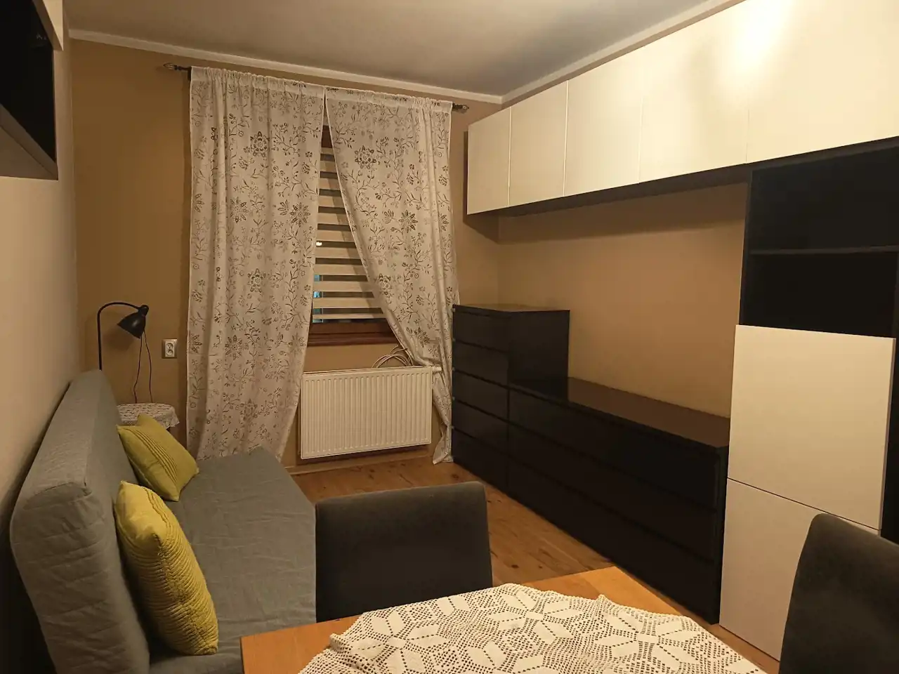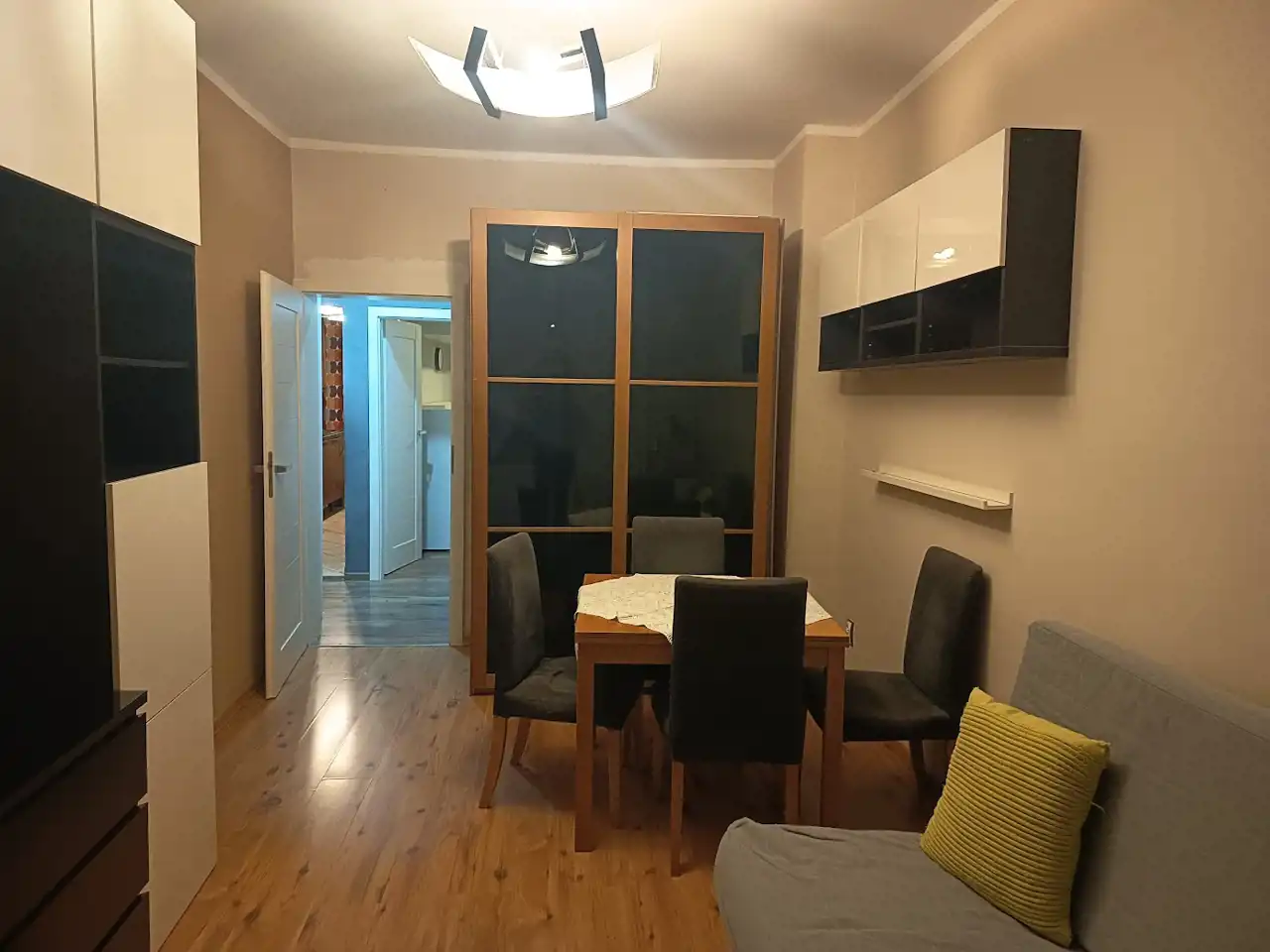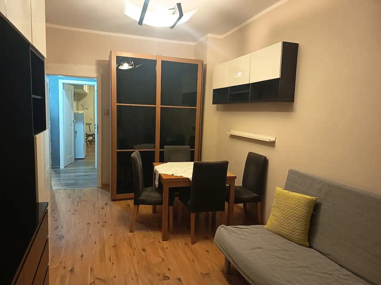 Pokój 1: wyposażenie obejmuje rozkładaną sofę, stół, 4 krzesła, szafę, szafkę RTV, komodę, podwieszane szafki.