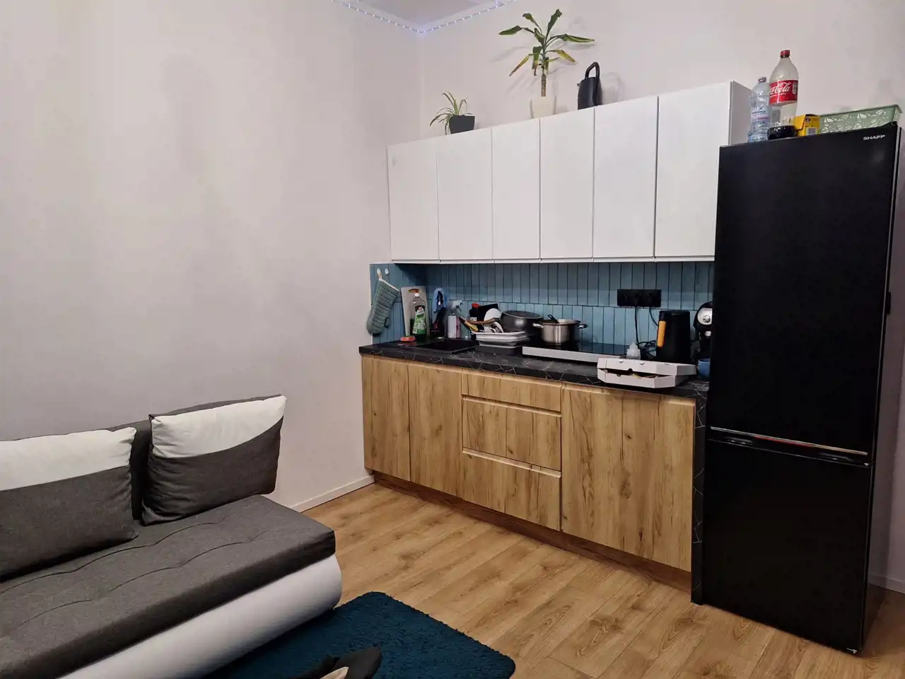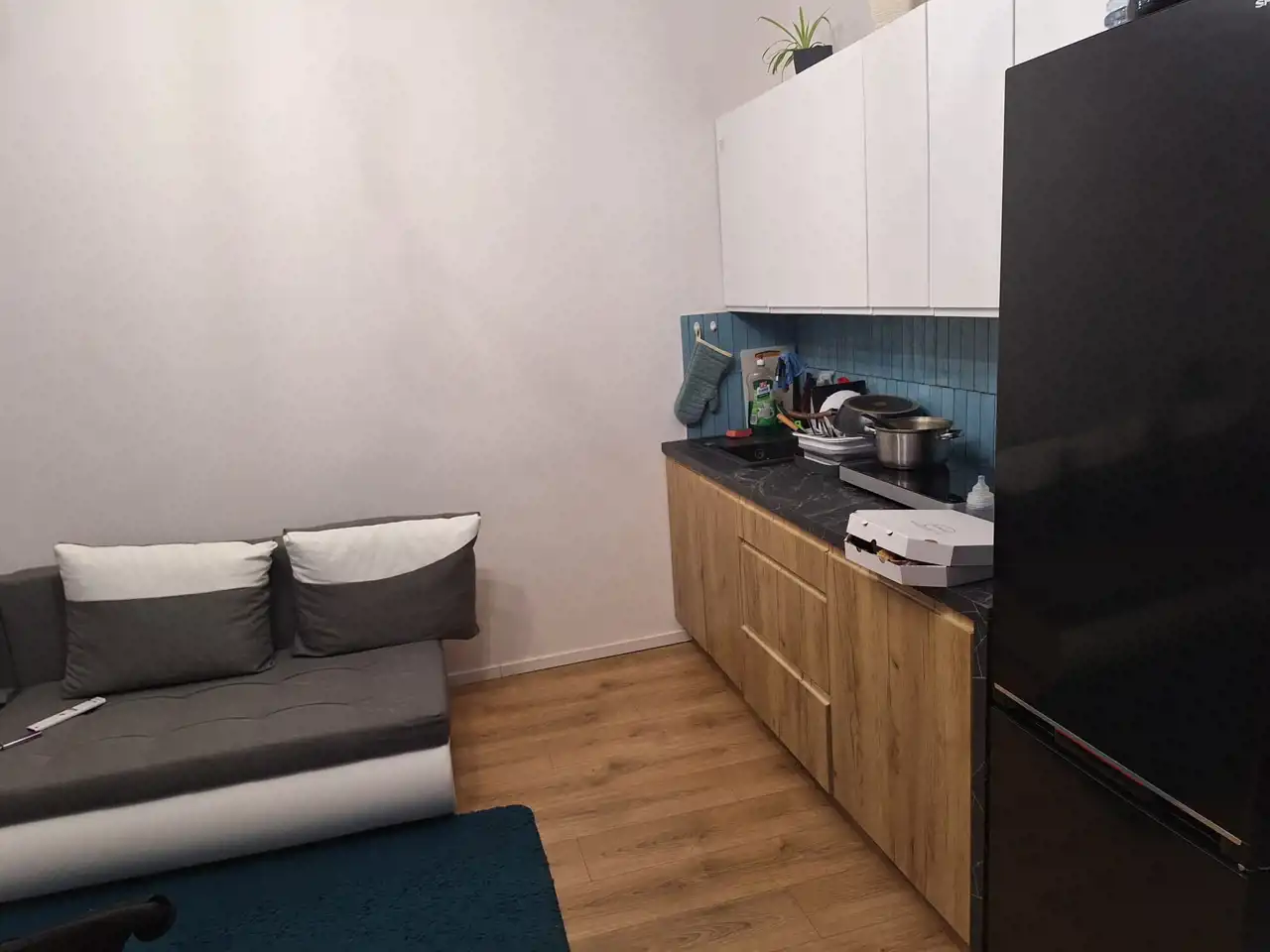 Pokój z aneksem kuchennym – całkowicie wyposażony (AGD), w przedpokoju duża szafa. Wszystkie niezbędne meble, z możliwością drobnego doposażenia według potrzeb najemcy.