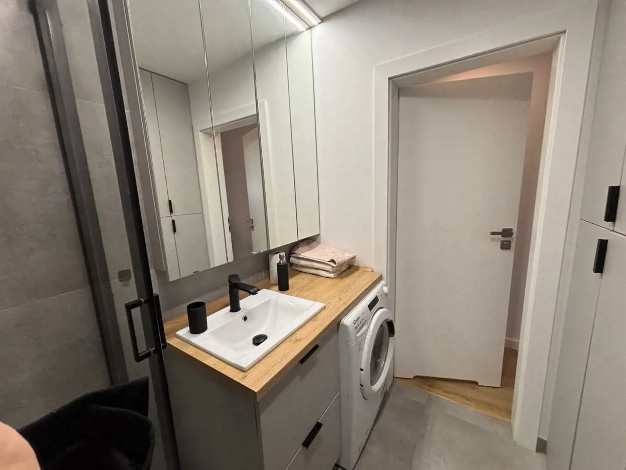 Studio składa się z pokoju z aneksem kuchennym oraz łazienki z prysznicem. Wnętrze jest jasne, zadbane i bardzo ciepłe, co przekłada się na niskie koszty ogrzewania.