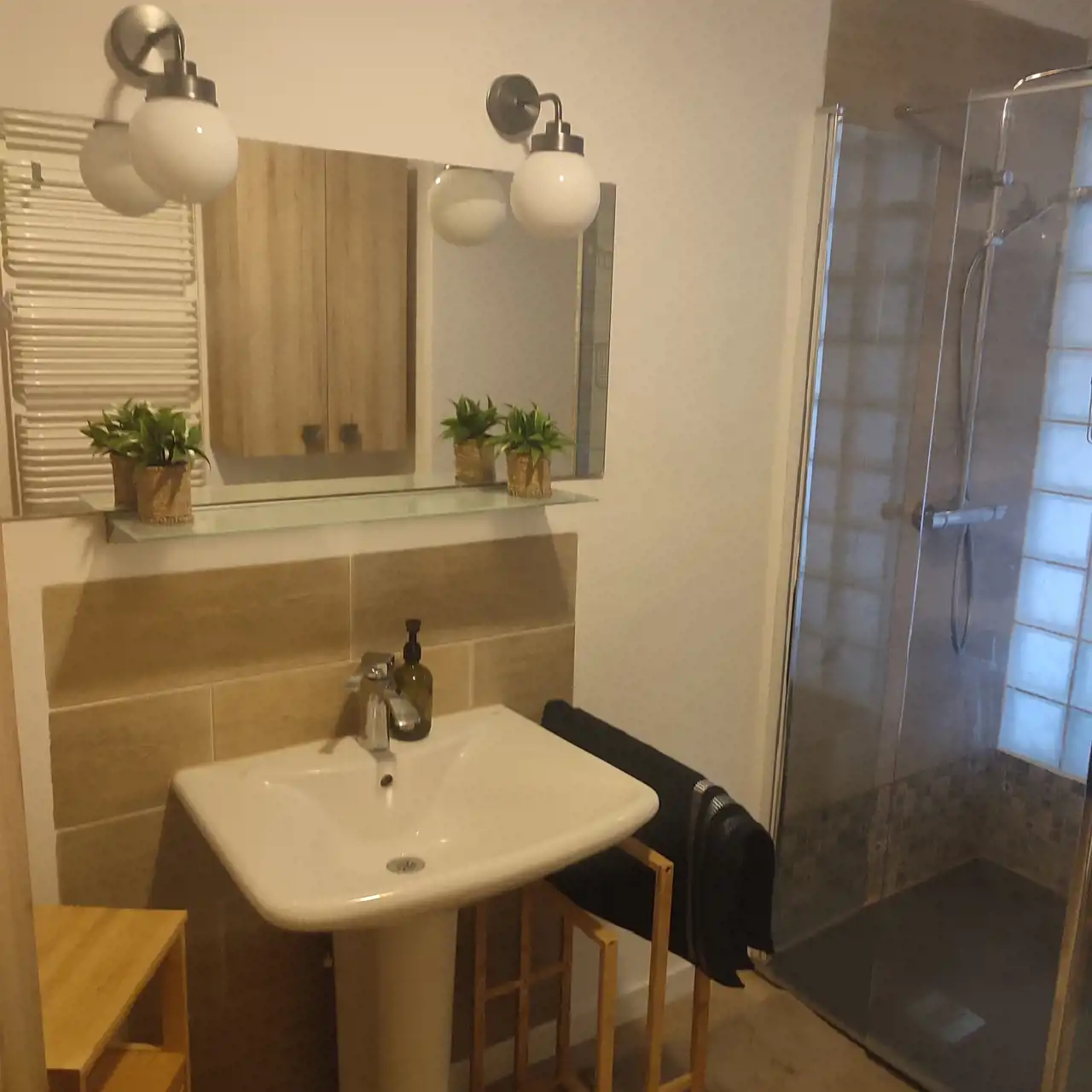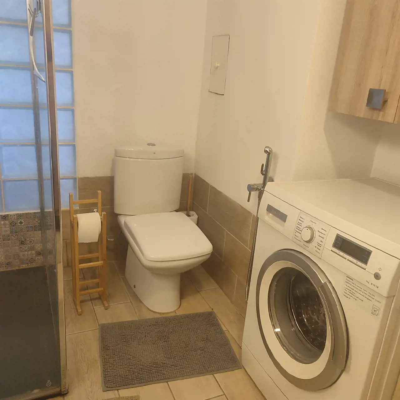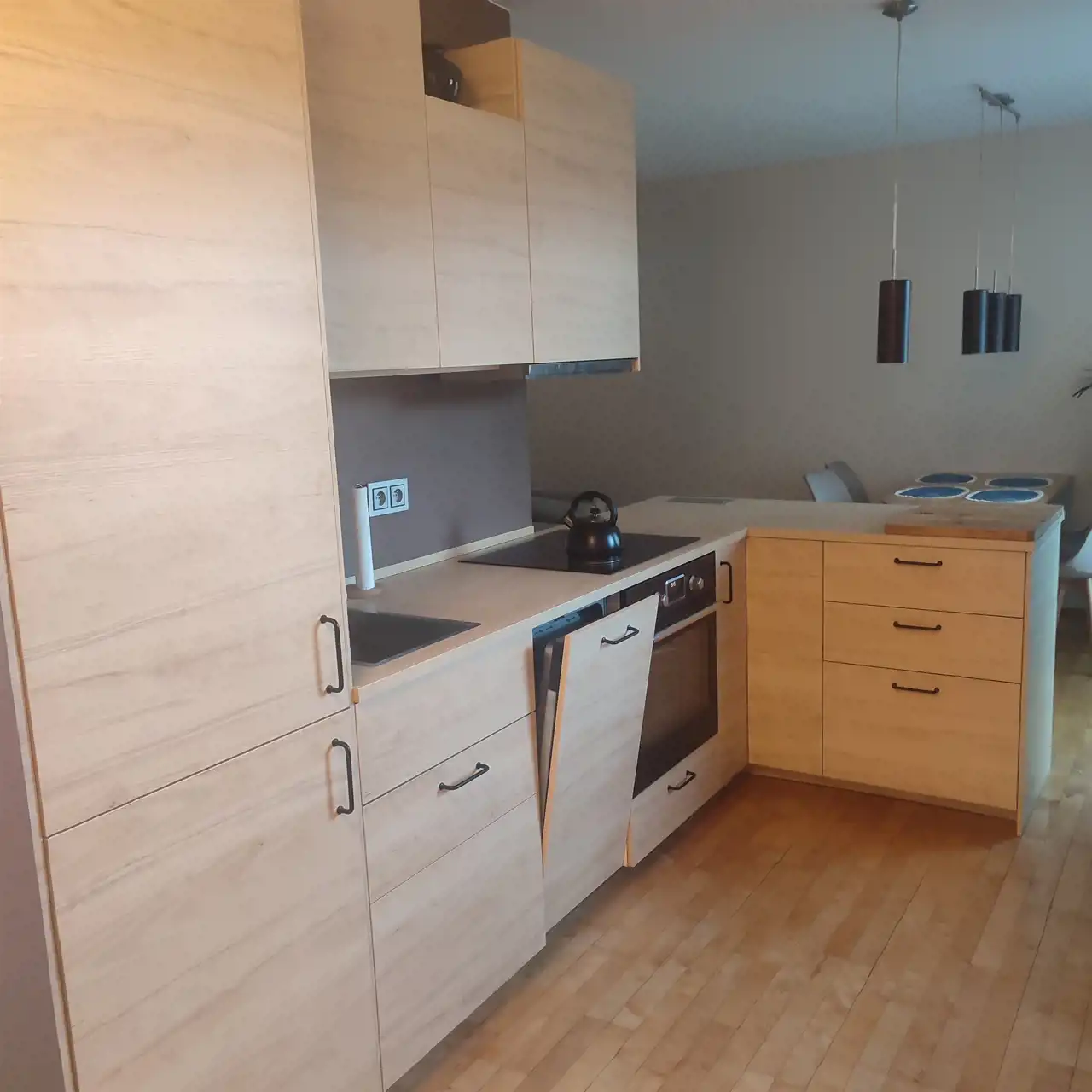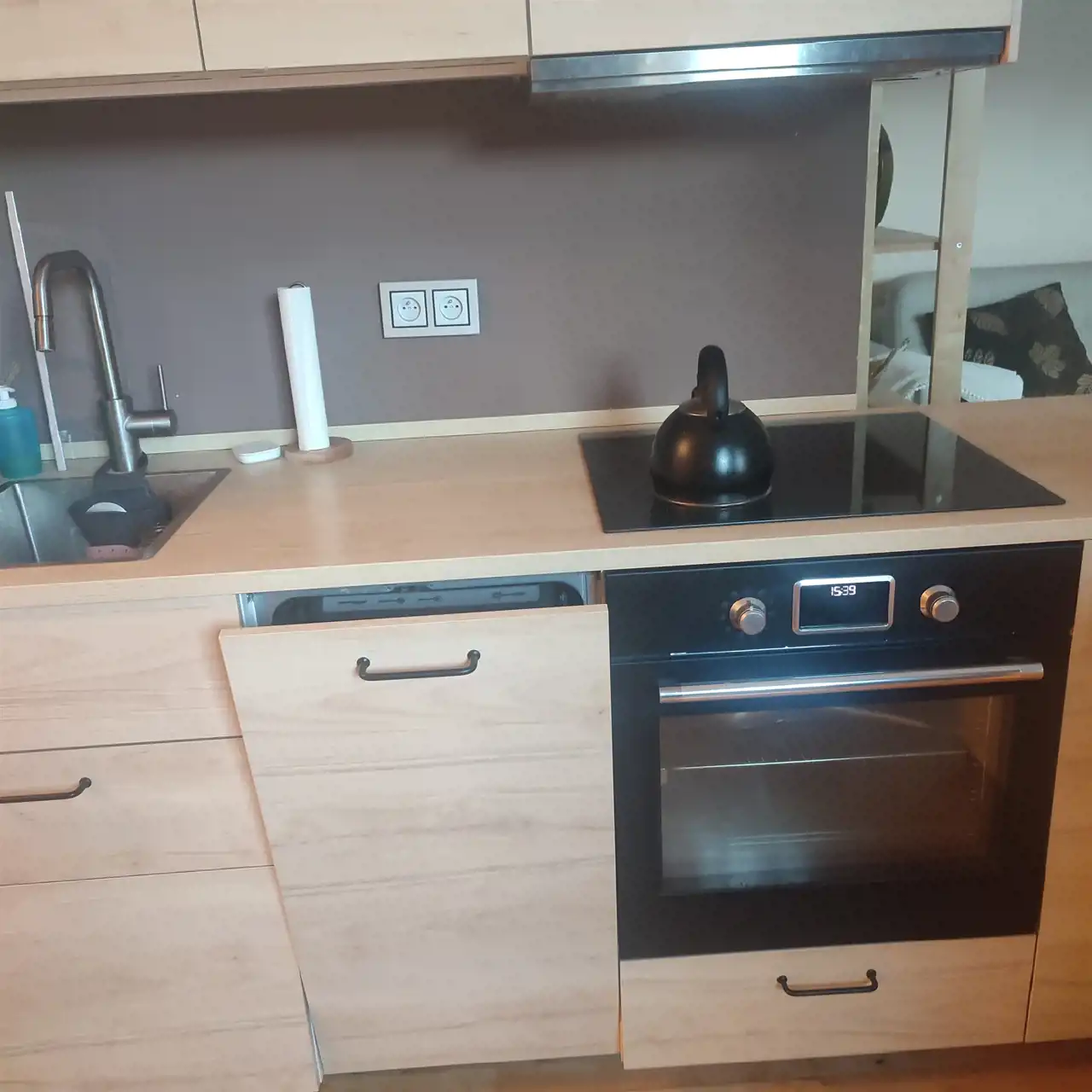 Kuchnia ze sprzętem AGD, łazienka kabina prysznicowa, pralka. W pokoju szafy w zabudowie.