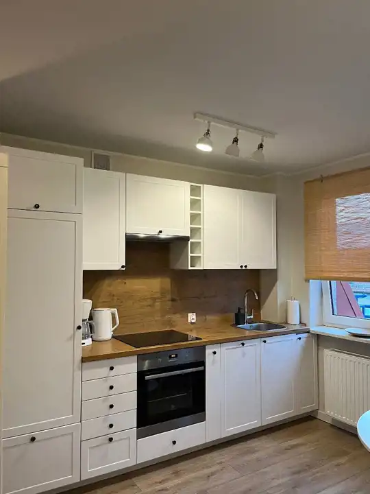 Aneks kuchenny: ze sprzętami i meblami w zabudowie (płyta z piekarnikiem, okap, zlew, lodówka z zamrażarką w zabudowie, zmywarka). Stolik, 4 krzesła.