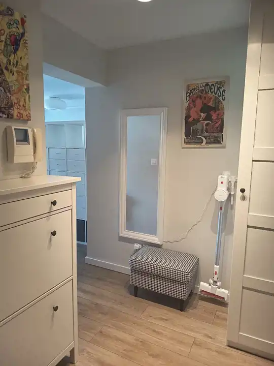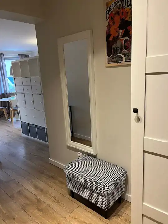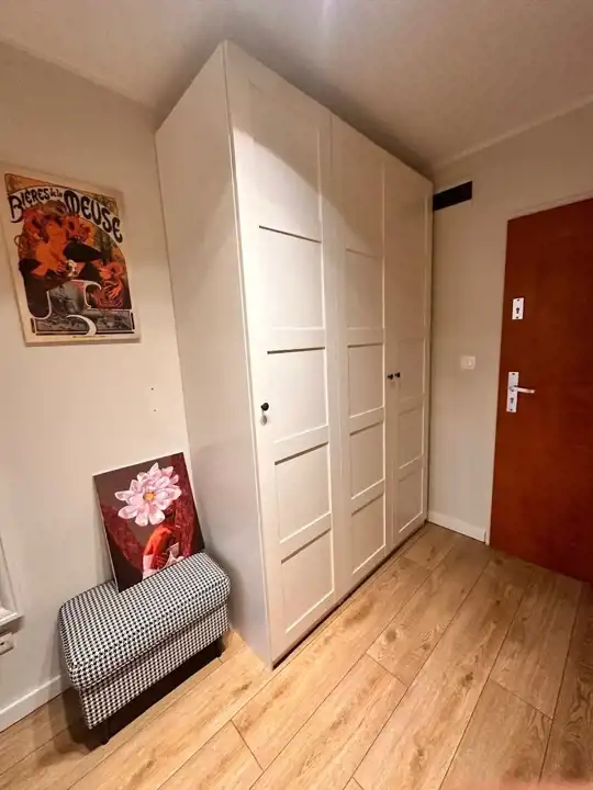 Powierzchnia mieszkania (32 mkw) podzielona jest na strefy częściowo oddzielone przepierzeniem z szafy – cześć kuchenno – jadalniana, część salonowo – sypialniana. Łazienka i przedpokój.