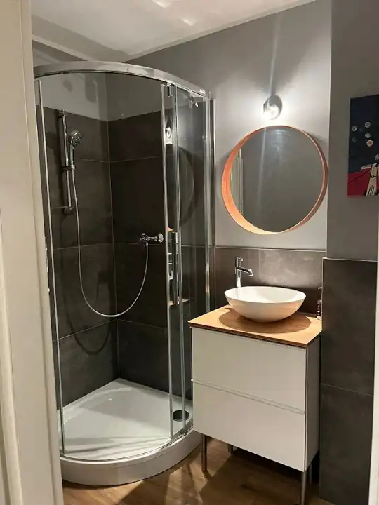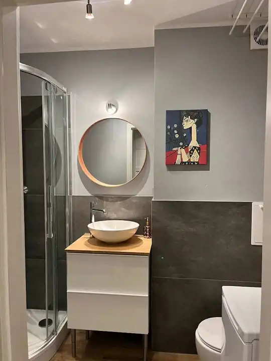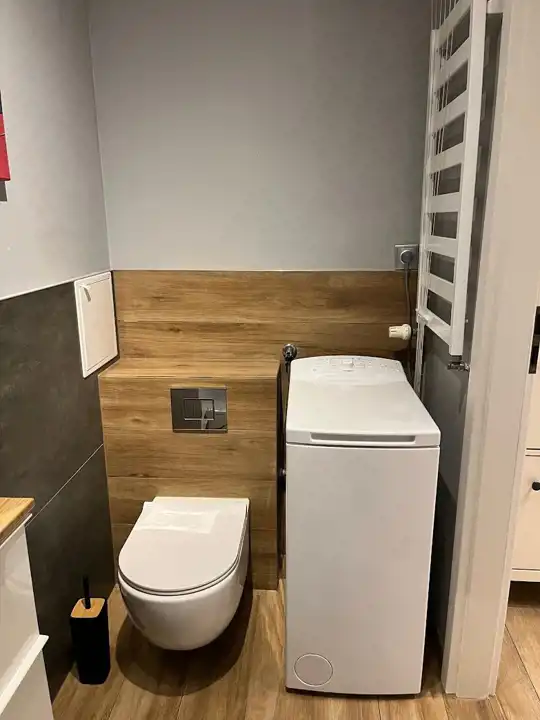 Łazienka: kabina prysznicowa, umywalka, toaleta, szafki, pralka.