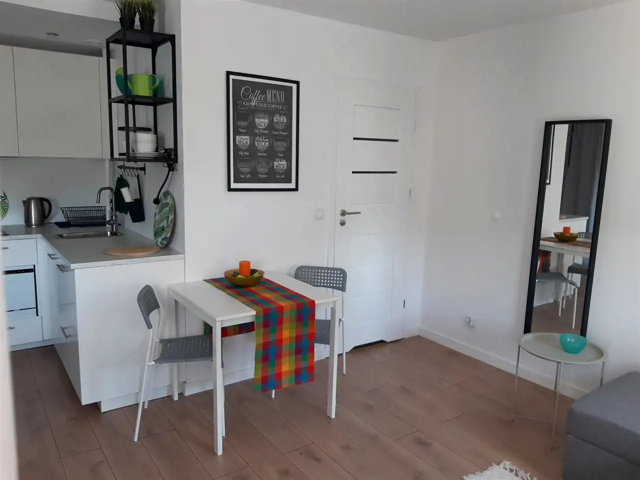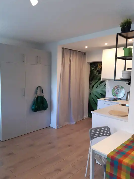 Mieszkanie składa się z przestronnego pokoju z balkonem, mini aneksu kuchennego i łazienki.