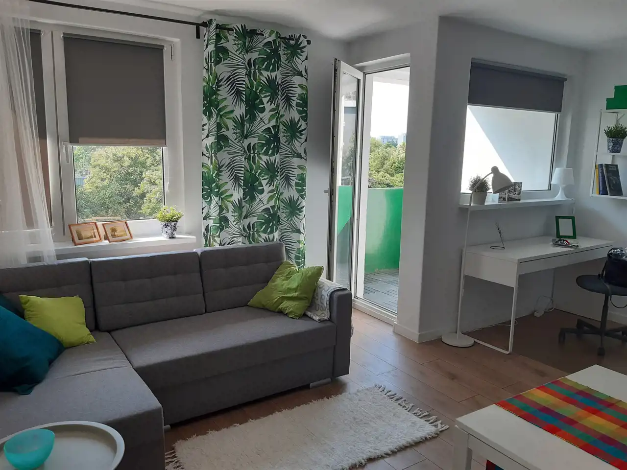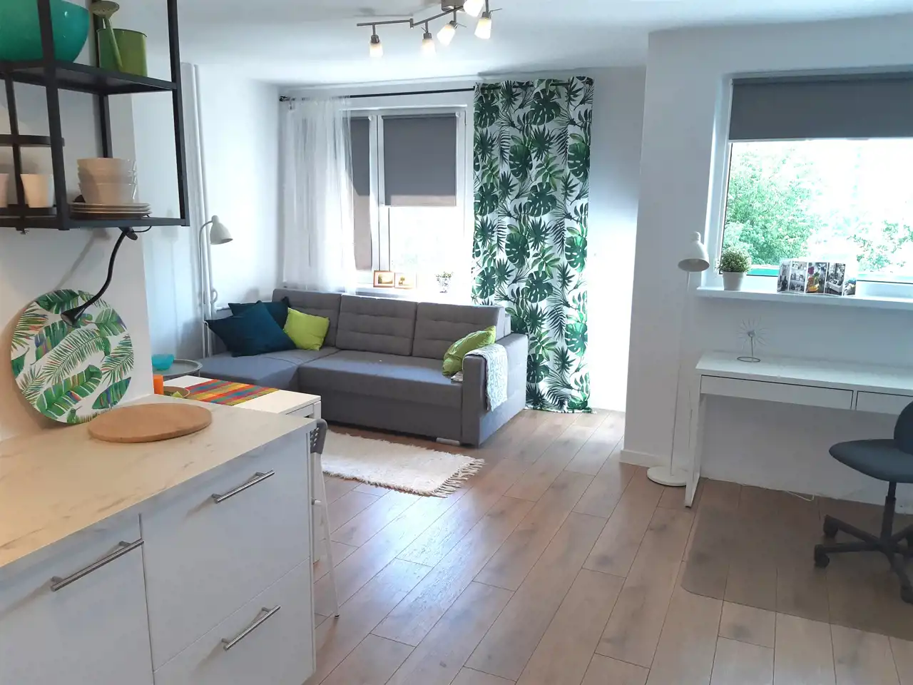Wyposażony w rozkładaną kanapę, dużą szafę, biurko.