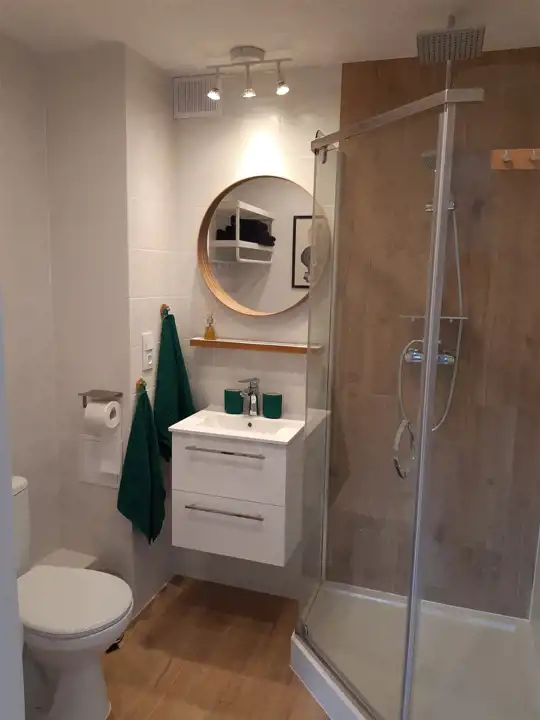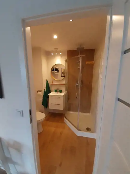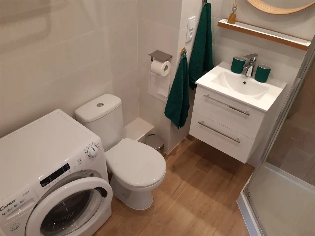 Łazienka z kabiną prysznicową i pralką.
