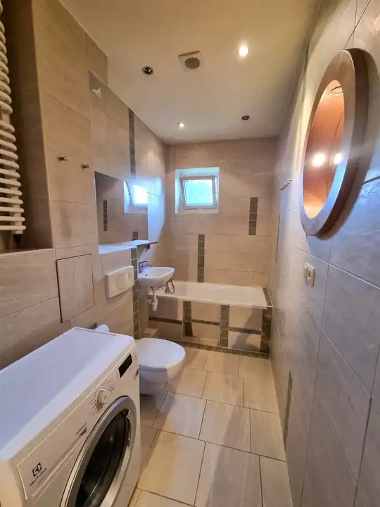 Łazienka: Z oknem, wyposażona w wannę oraz pralkę.