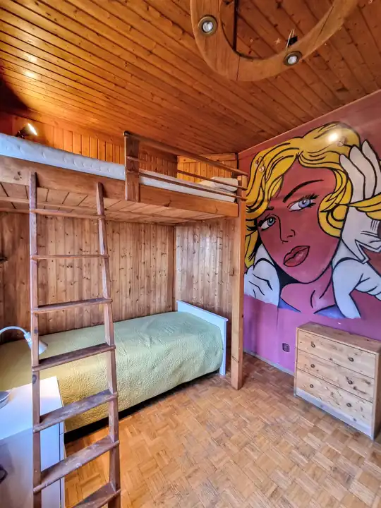 Sypialnia 1 (13 m²): Wyposażona w łóżko pojedyncze, szafę, regał oraz antresolę z dodatkowym miejscem do spania.