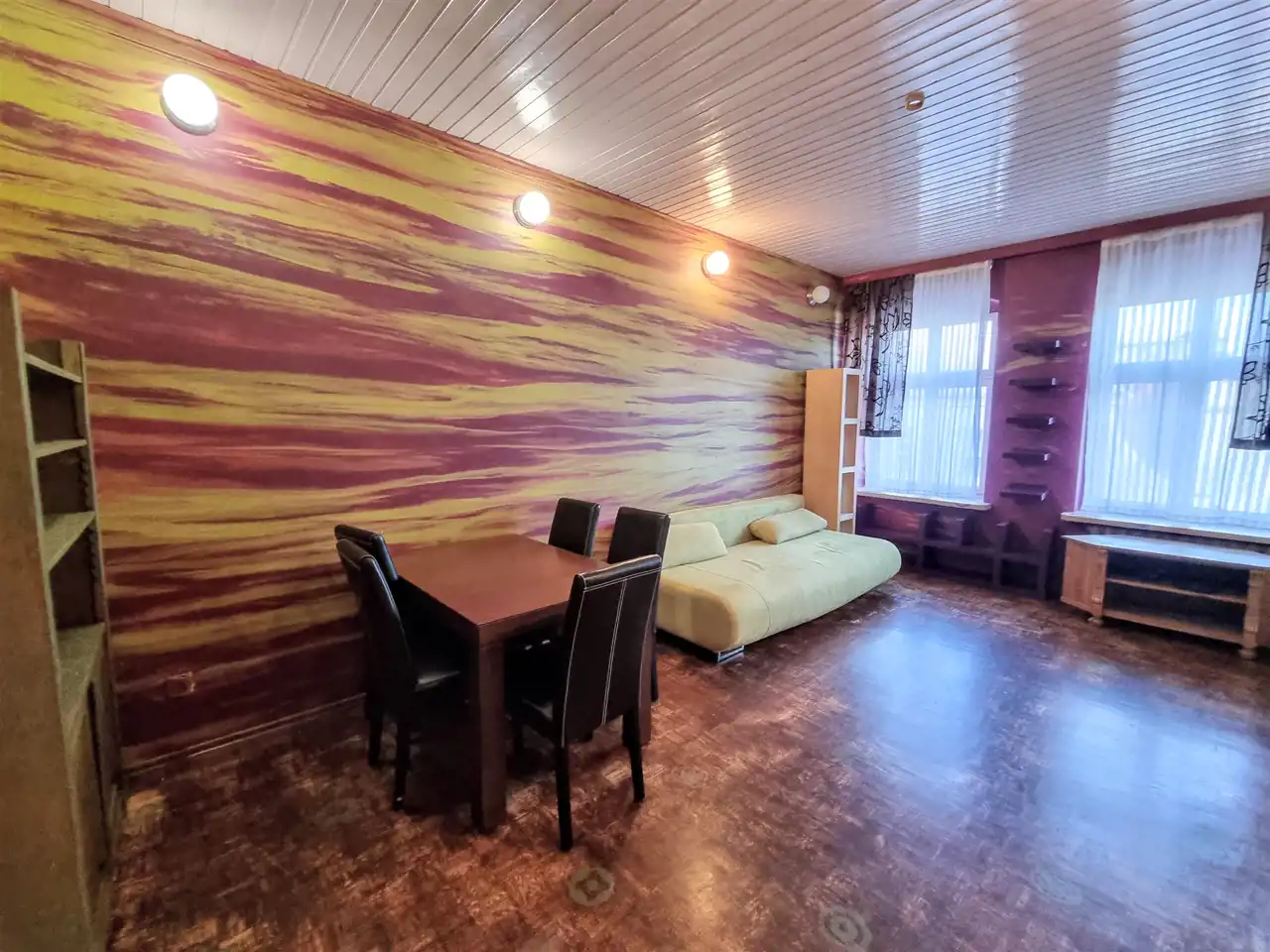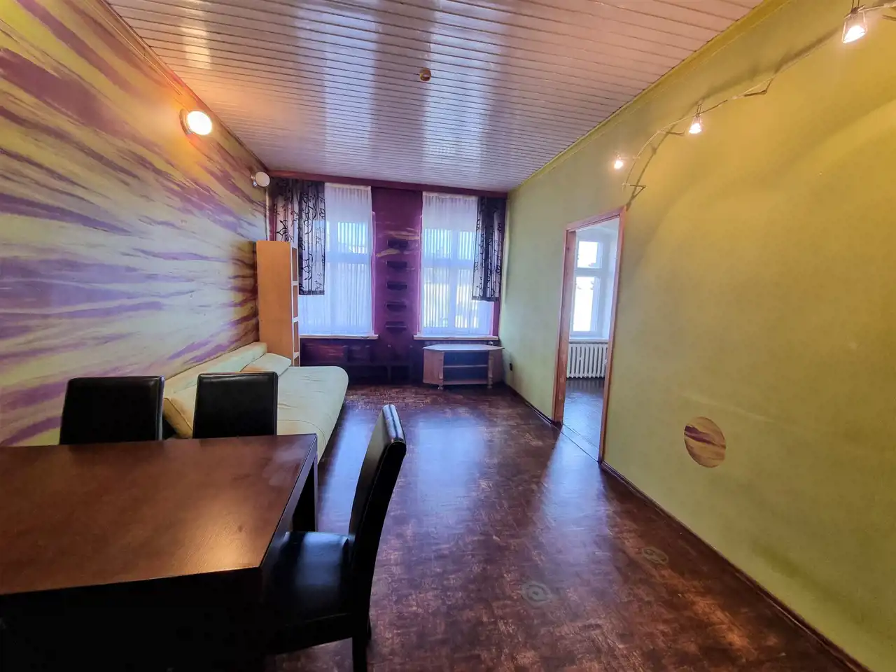 High ceilings (3,5 m) and interesting colourful interiors