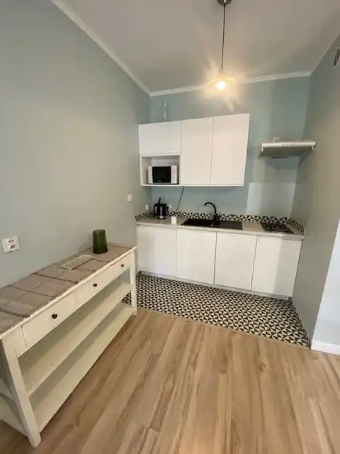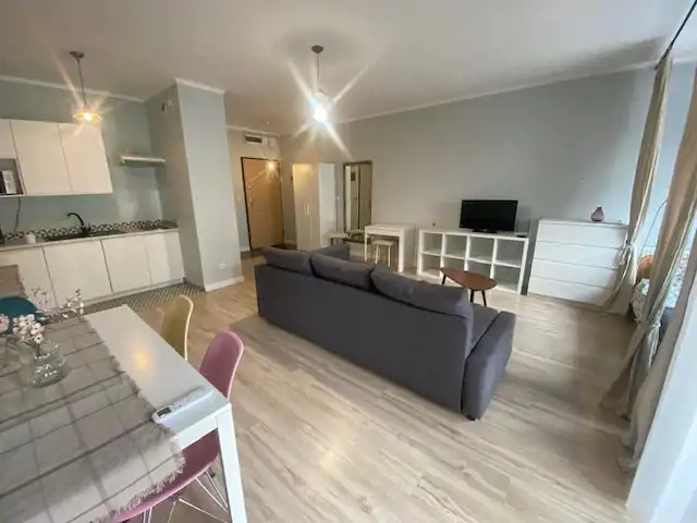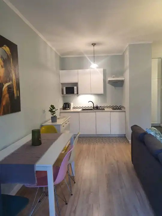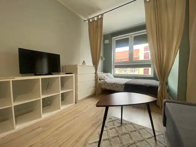 Property description: New studio apartment situated in the brand new building. The apartment consists of living room with open plan kitchen and open plan bedroom, bathroom and hallway. The apartment has a pleasant, modern interior, ideal for demanding customers. The apartment is fully furnished. The kitchenette has been equipped with a fridge, a dishwasher, a ceramic hob and an oven. I would recommend.