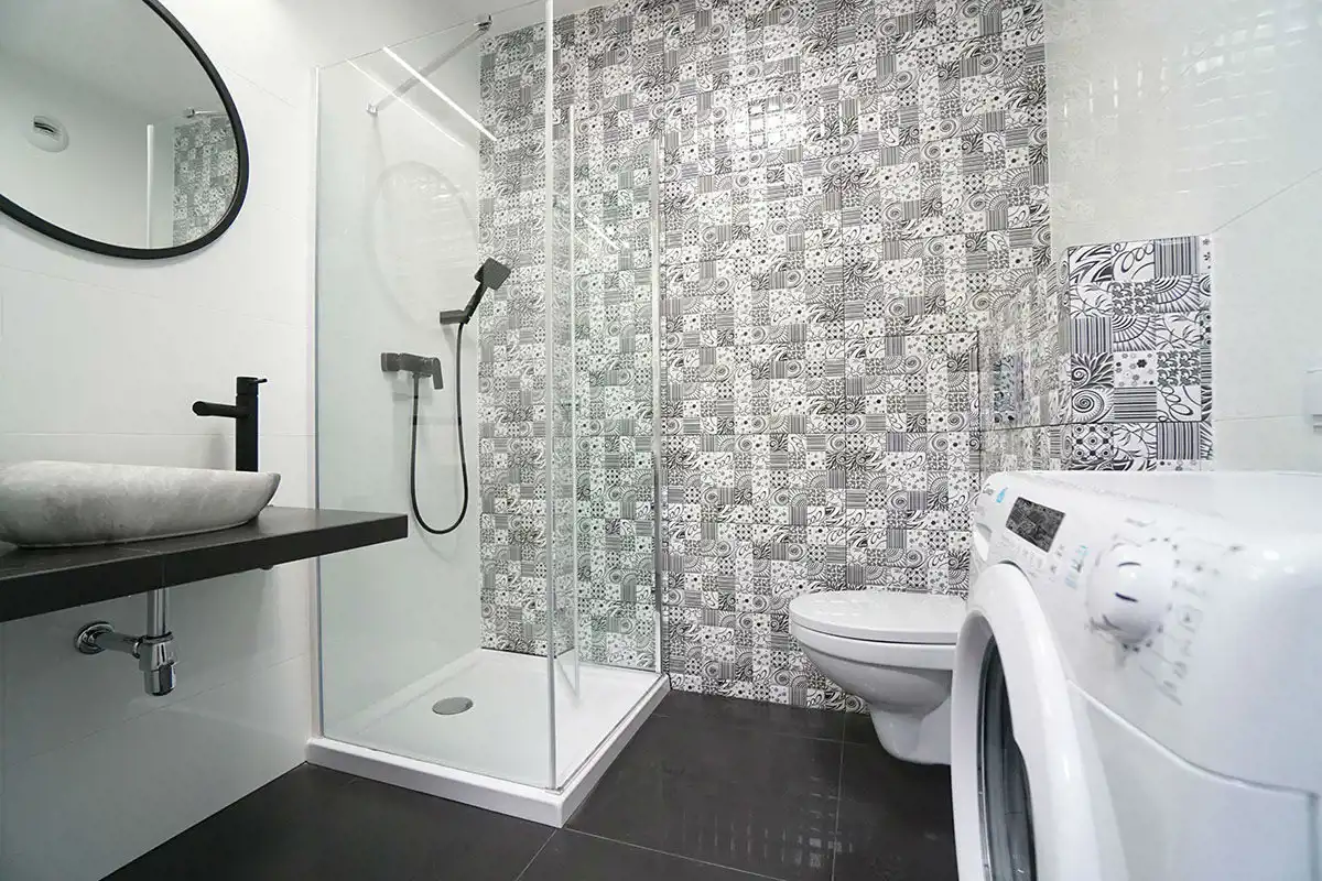 W łazience: pralka, prysznic oraz szafka pod zabudowę nad toaletą - nie widać jej na foto.