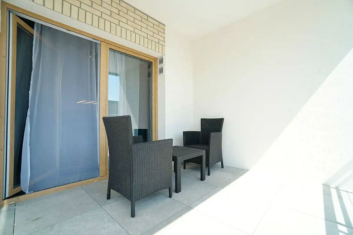 Na tarasie : wygodny komplet wypoczynkowy oraz fotel bujany w kształcie "jaja".
