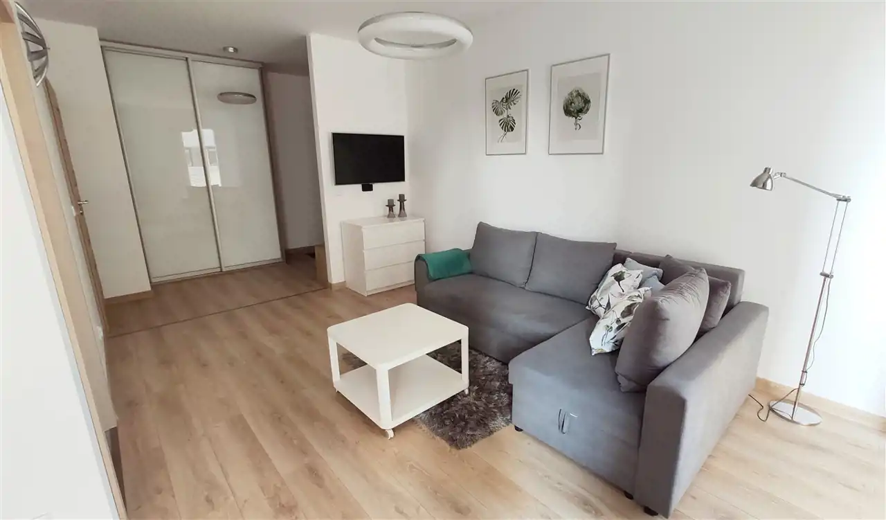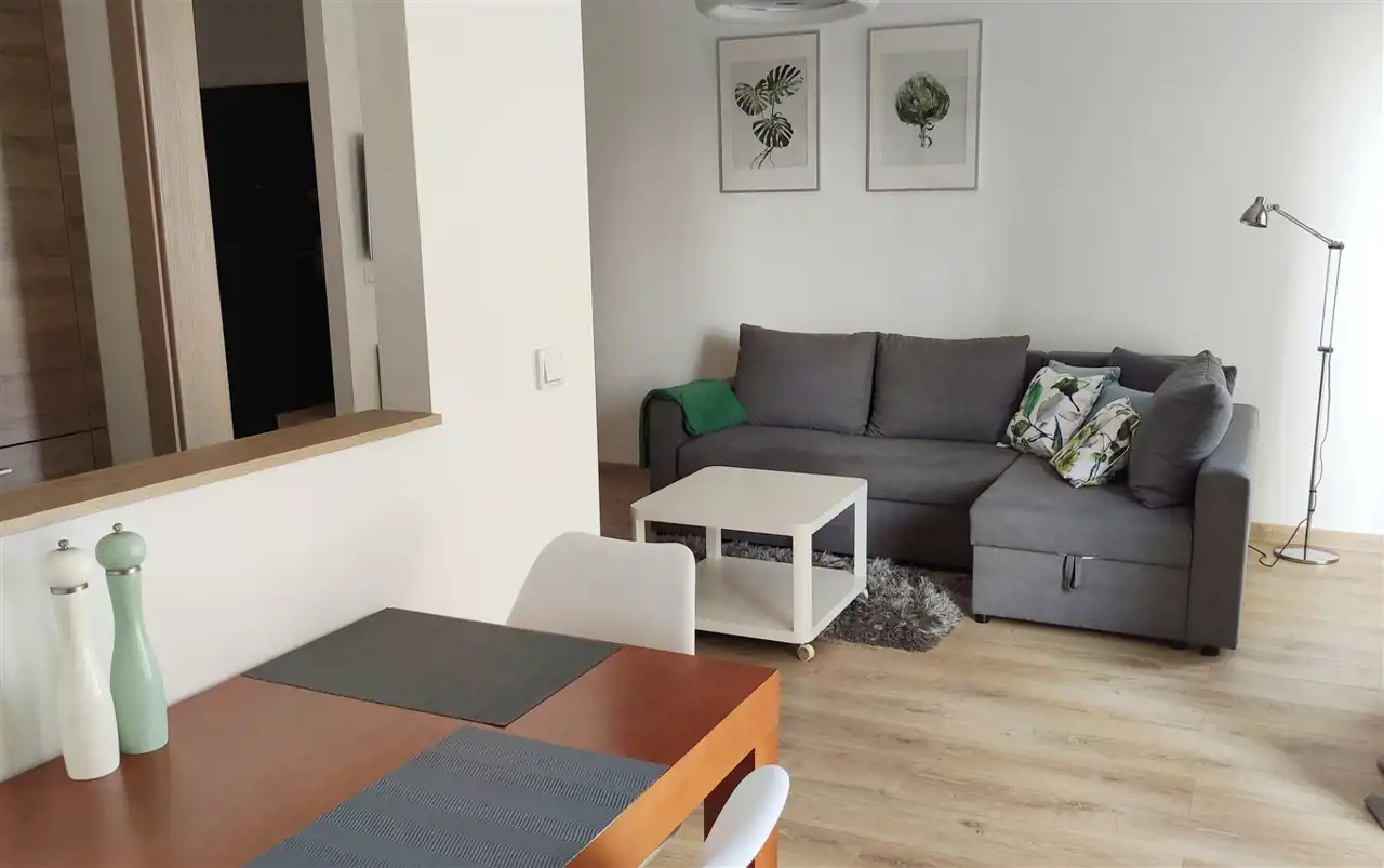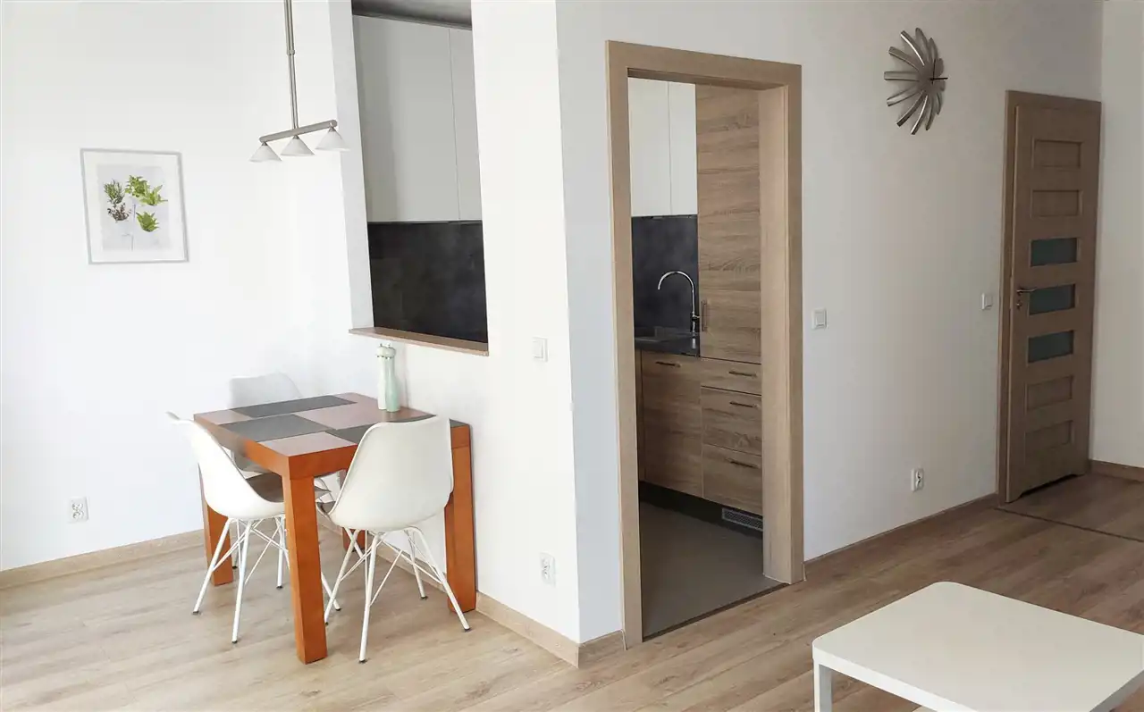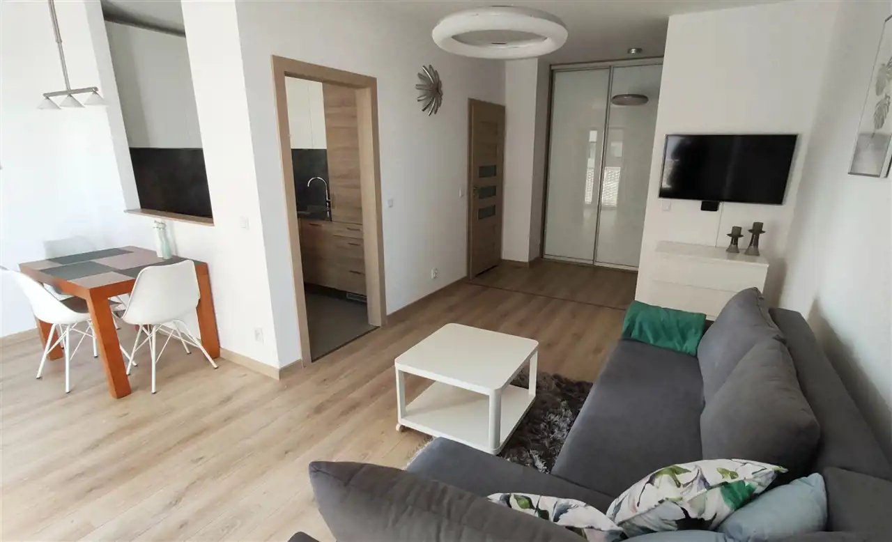 Mieszkanie jest w pełni wyposażone i umeblowane. Kuchnia z meblami w zabudowie i sprzętem AGD, wyposażona w naczynia do gotowania i do spożywania posiłków. Przestronny pokój z kanapą (narożnik), meblami, TV, stołem z krzesłami. Z pokoju wyjście na balkon (loggia). W łazience wanna z funkcją prysznica i pralka. W przedpokoju wygodna dwuskrzydłowa szafa w zabudowie.