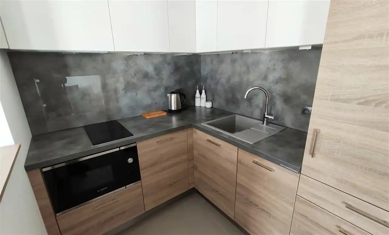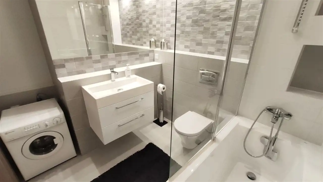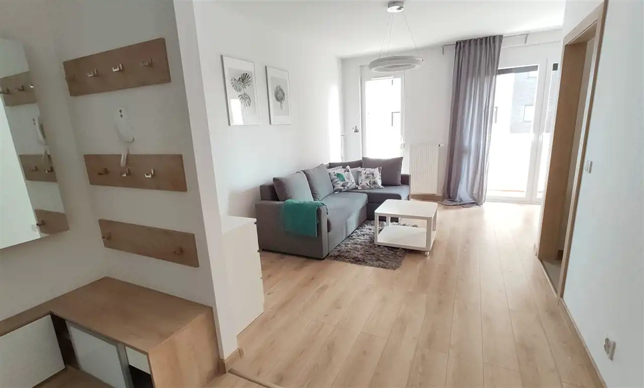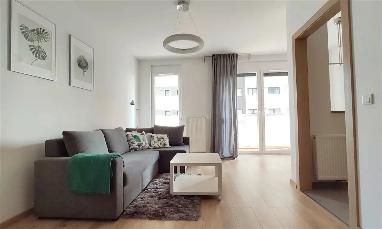 Mieszkanie jest w pełni wyposażone i umeblowane. Kuchnia z meblami w zabudowie i sprzętem AGD, wyposażona w naczynia do gotowania i do spożywania posiłków. Przestronny pokój z kanapą (narożnik), meblami, TV, stołem z krzesłami. Z pokoju wyjście na balkon (loggia). W łazience wanna z funkcją prysznica i pralka. W przedpokoju wygodna dwuskrzydłowa szafa w zabudowie.