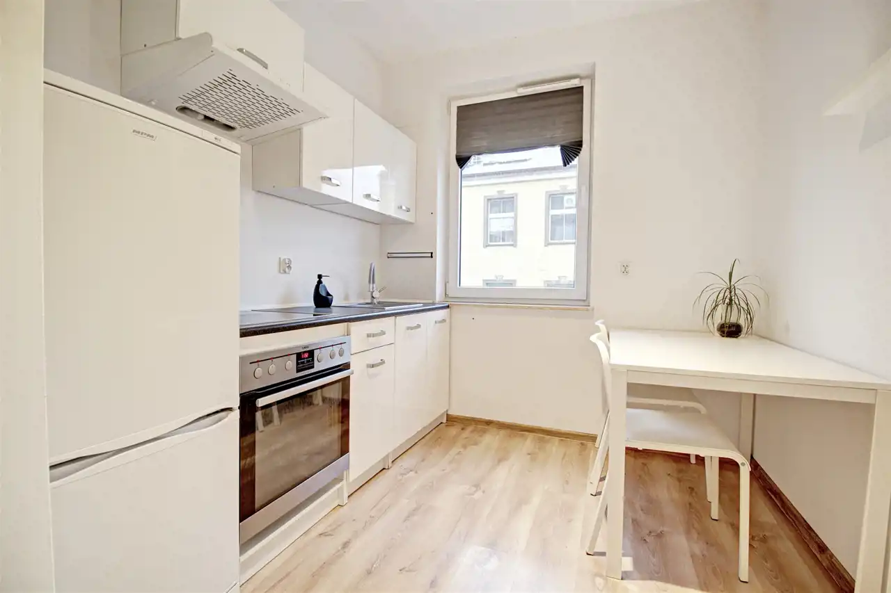 Lokal mieści się na trzecim piętrze w pięciopiętrowym budynku z windą. Mieszkanie składa się z dwóch osobnych pokoi, oddzielnej kuchni, wyposażonej w niezbędne sprzęty AGD, łazienki, przedpokoju oraz balkonu. Wszystkie media miejskie.