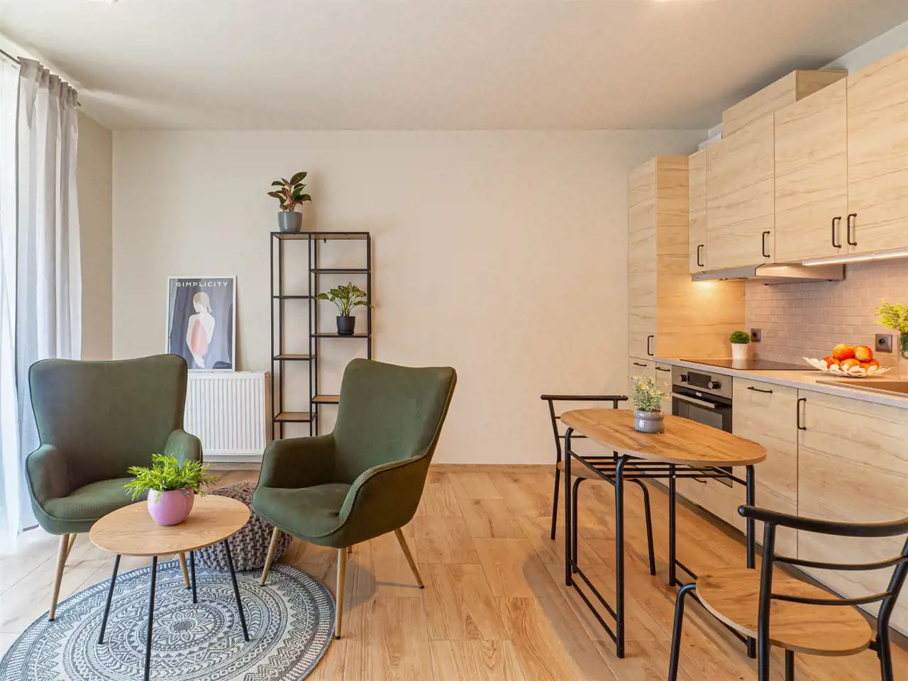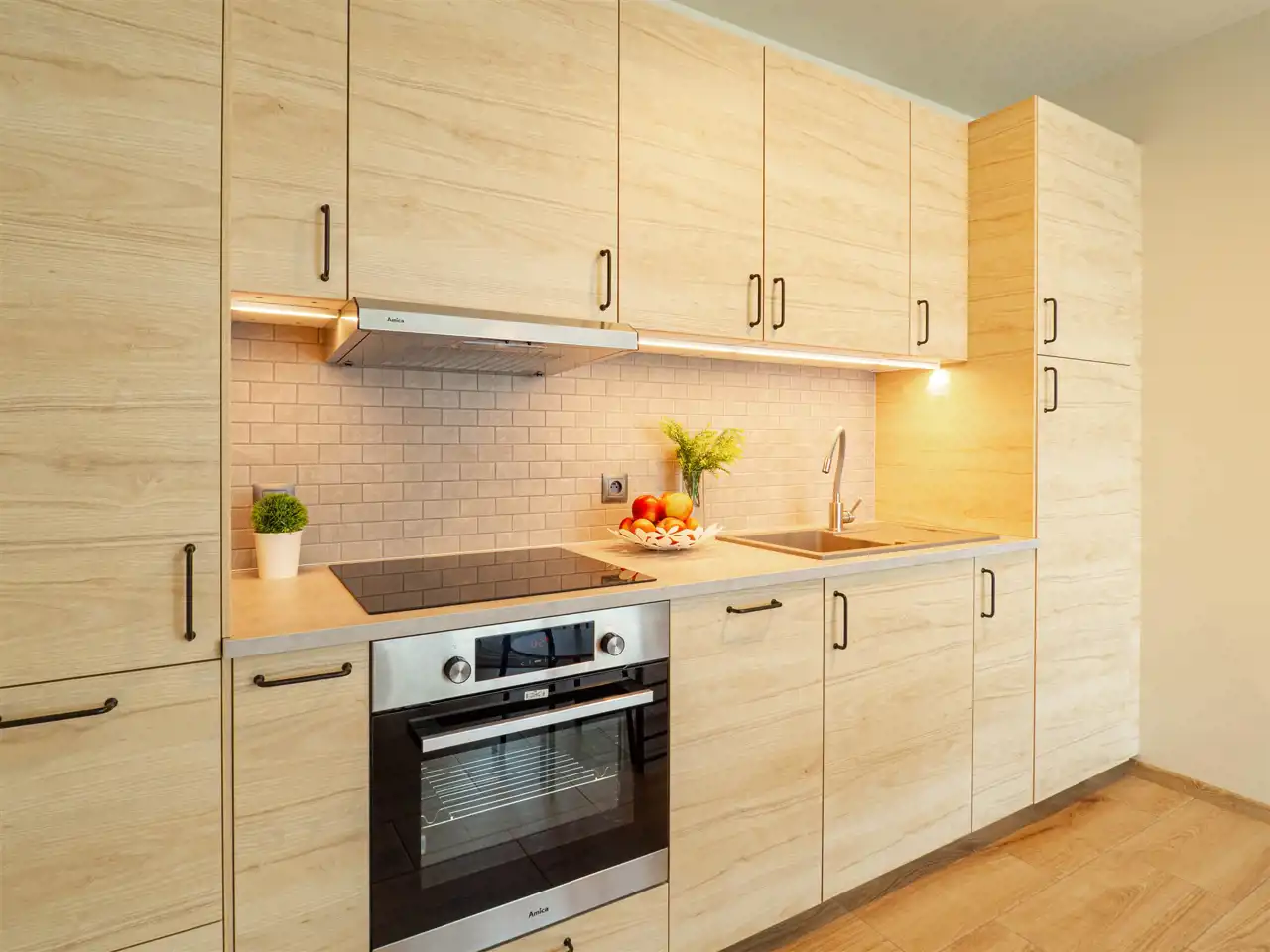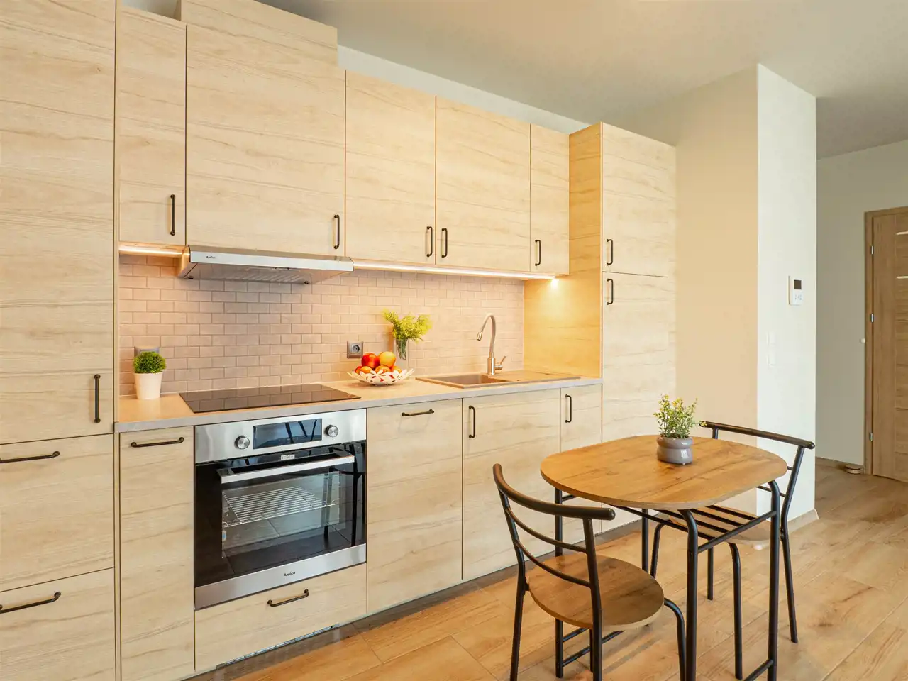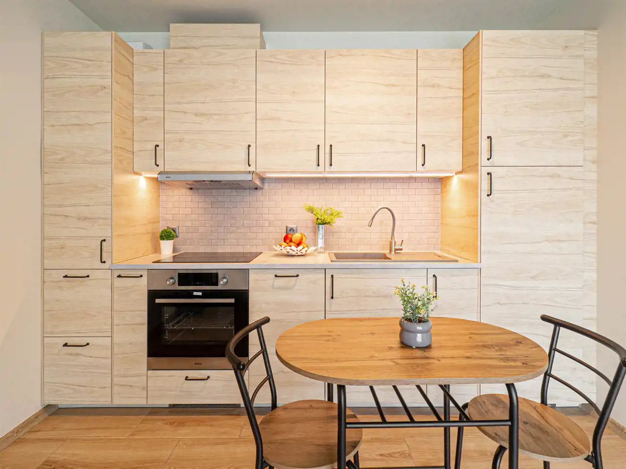 - aneksu kuchennego z dużą ilością szafek do przechowywania sprzętów kuchennych, na wyposażeniu również stolik z krzesłami. Aneks kuchenny wyposażony został we wszystkie niezbędne sprzęty AGD: lodówko-zamrażalką w zabudowie, indukcją, piekarnikiem, zmywarką.
