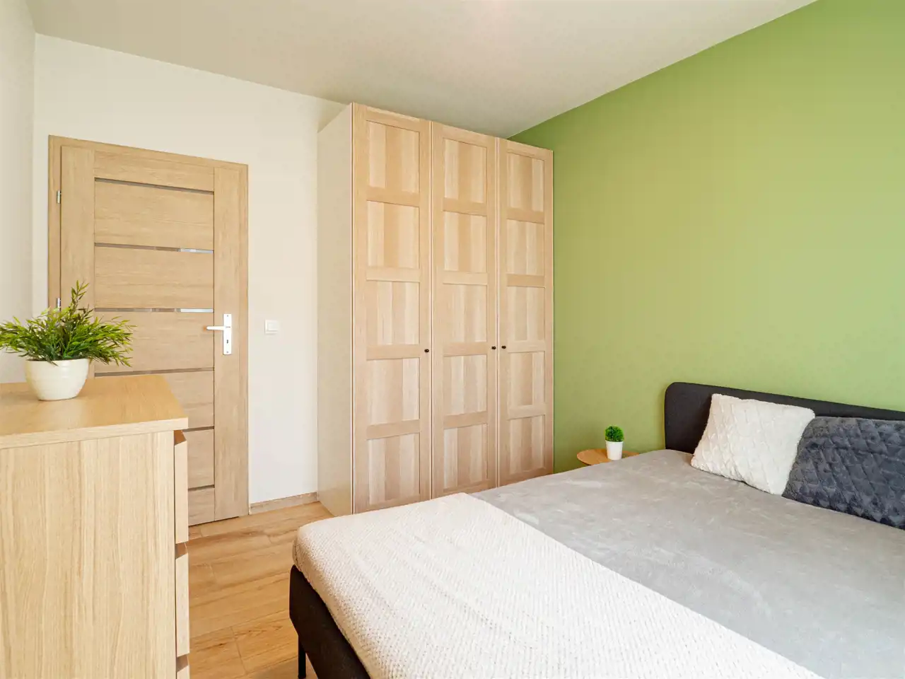 - przytulnej sypialni z łóżkiem podwójnym, szafy w zabudowie do przechowywania odzieży oraz komody,