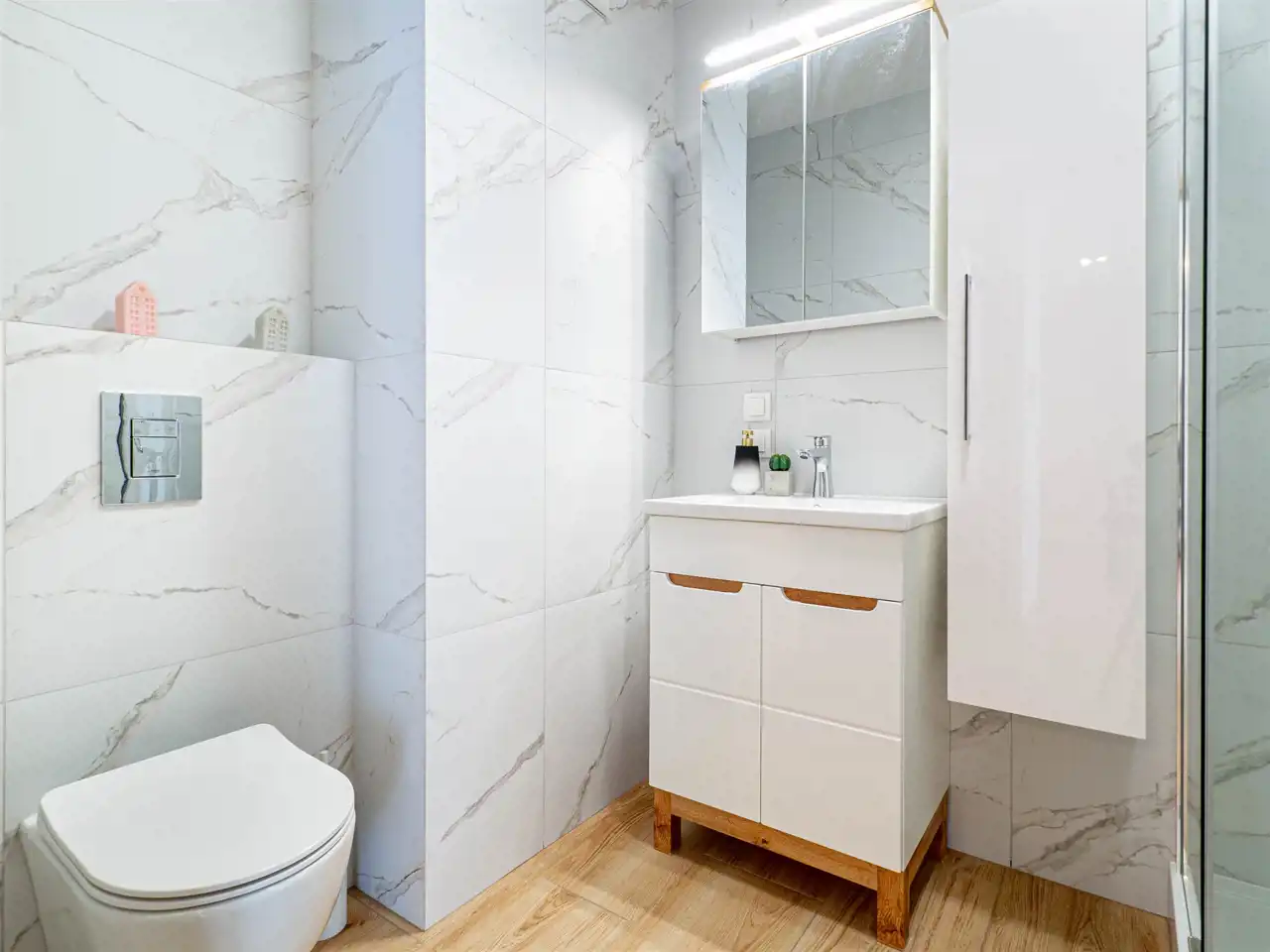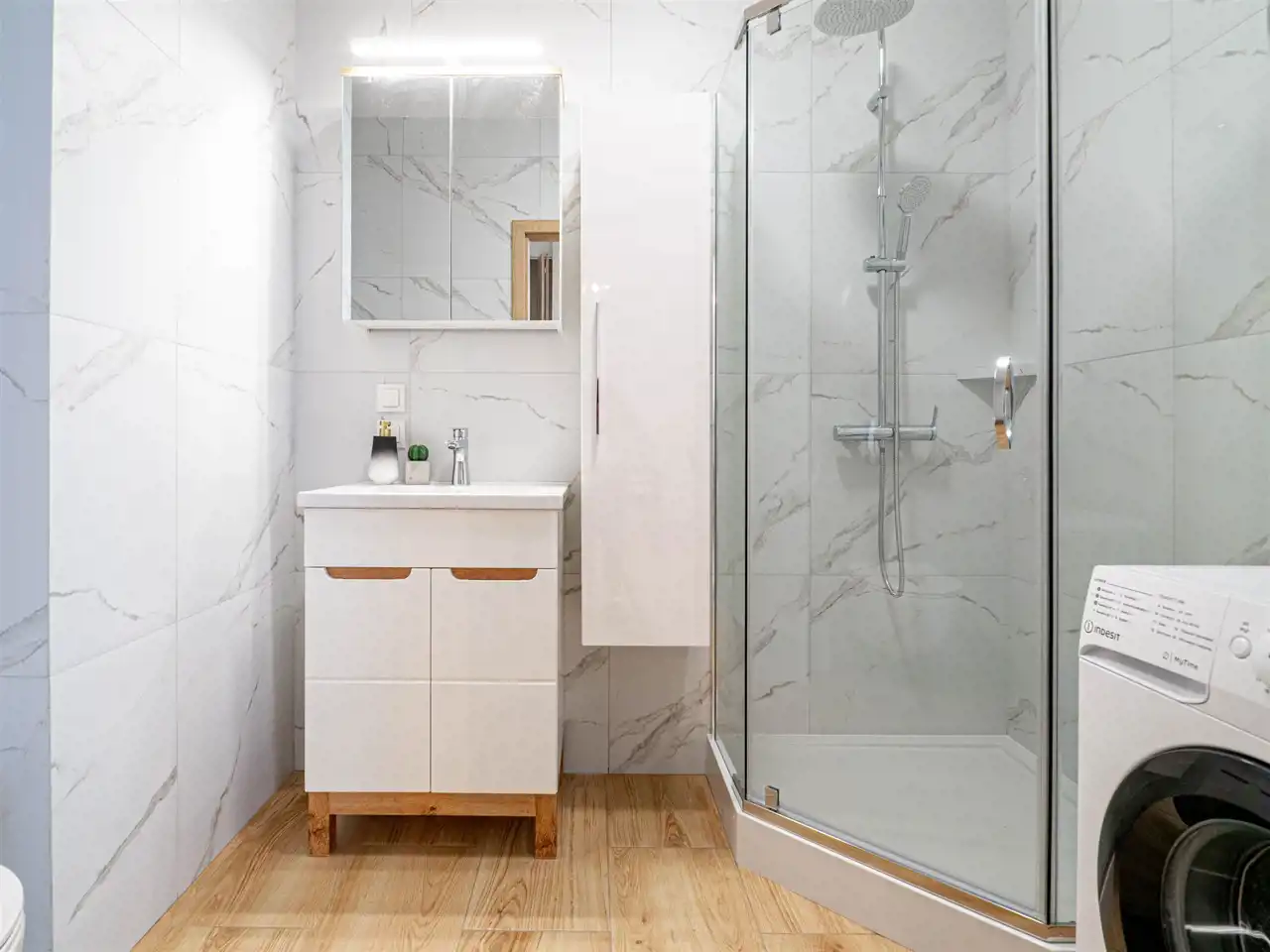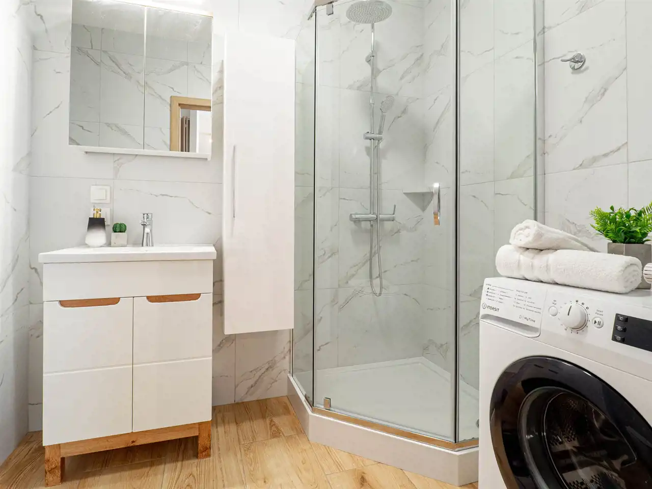 - nowocześnie wykończonej łazienki z prysznicem, pralką oraz szafkami.