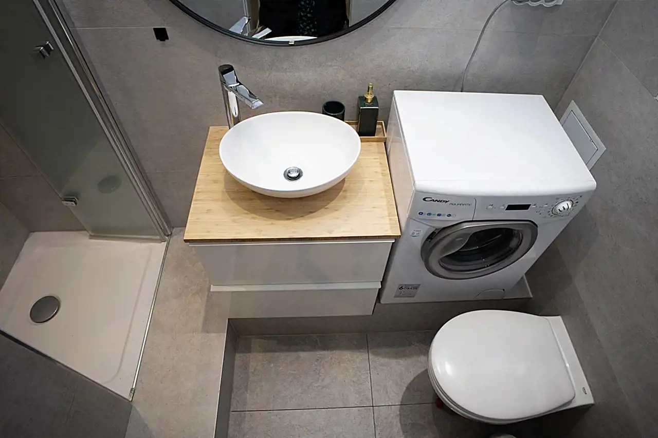 Łazienka z kabiną prysznicową, pralką. W przedpokoju pojemna szafa gospodarczo-garderobiana.