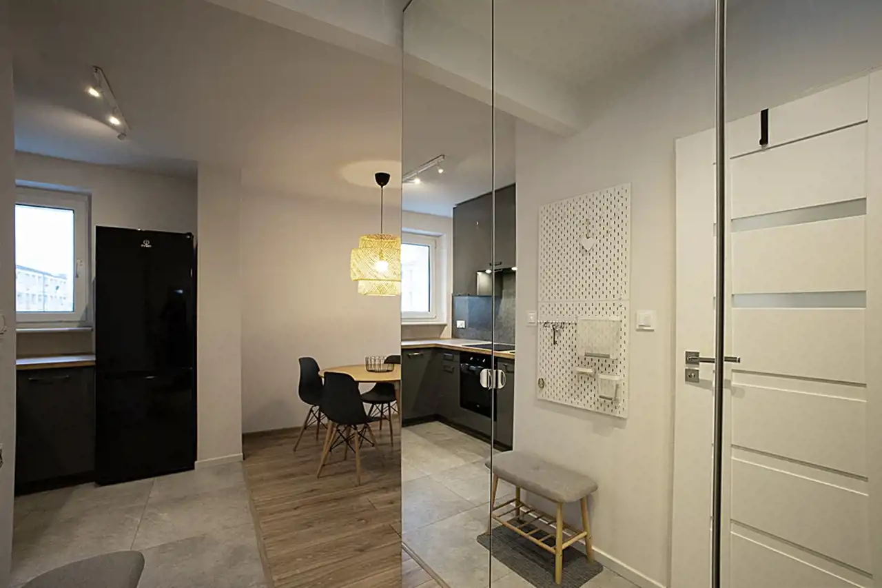 SZCZEGÓLNIE POLECAMYNowoczesna kuchnia z AGD w zabudowie: piekarnik, płyta indukcyjna oraz lodówko-zamrażarka. Aneks jadalny i salonik z wyjściem na balkon.