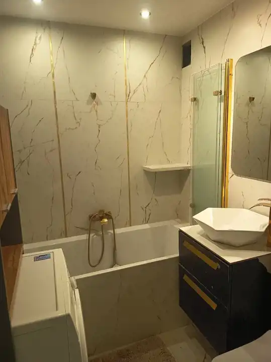 Łazienka: wanna, umywalka, toaleta, szafki, pralka.