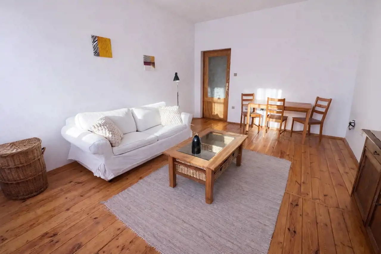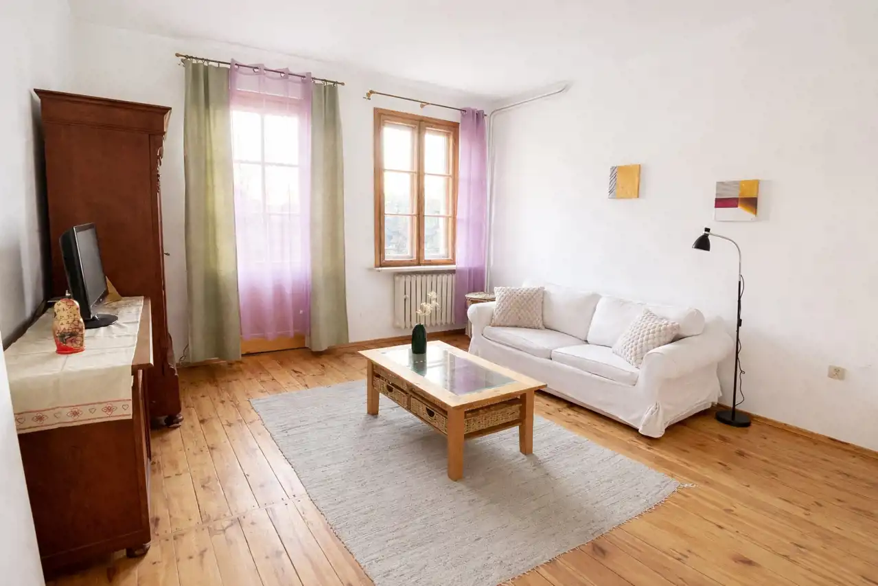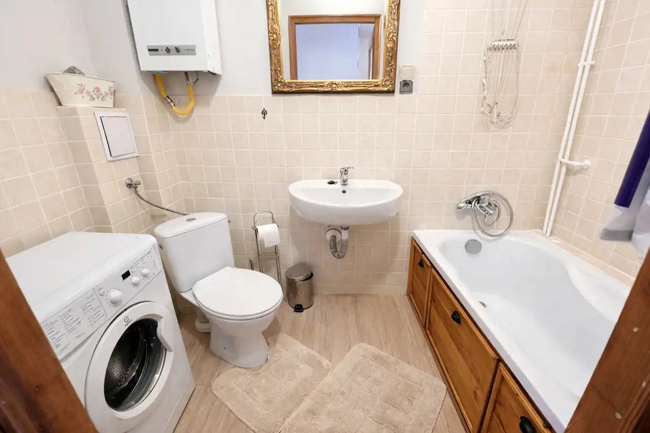 Jasne, przytulne wnętrza. Na podłodze deska. Mieszkanie jest w pełni wyposażone i przygotowane do zamieszkania. Kuchnia z meblami i sprzętem AGD: zmywarka, lodówka, kuchenka, piekarnik, małe agd. Dwa przestronne pokoje, łazienka z wanną i pralką. W przedpokoju dwie pojemne szafy w zabudowie. Ogrzewanie miejskie.