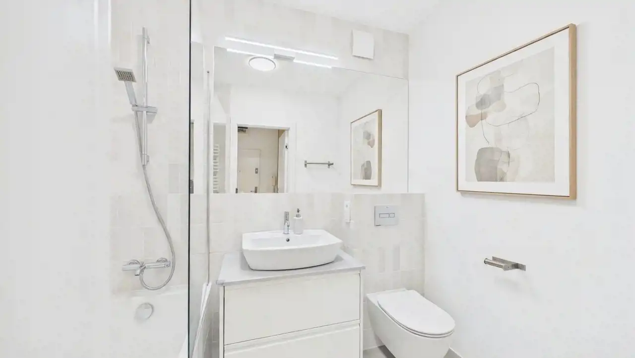 - Łazienka: Wanna z prysznicem, misa WC, szafka z umywalką, lustro.