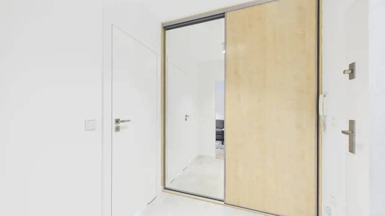 - Przedpokój: Pojemna szafa z lustrem w zabudowie, w której sprytnie ukryta jest pralka.