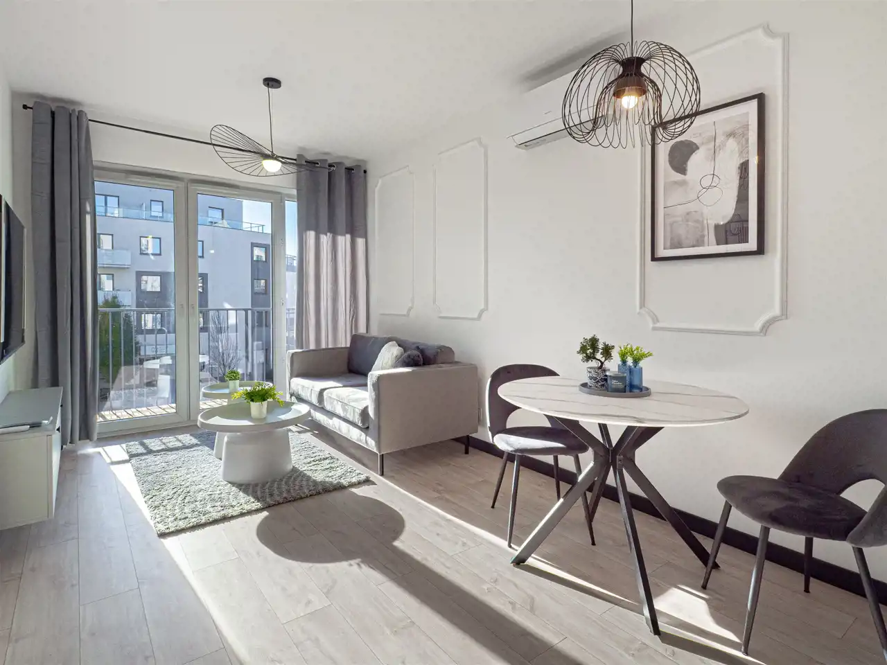 - dobrze oświetlonego salonu wyposażonego w sofę, stolik kawowy, szafkę rtv i telewizor. Z salonu wyjście na balkon.