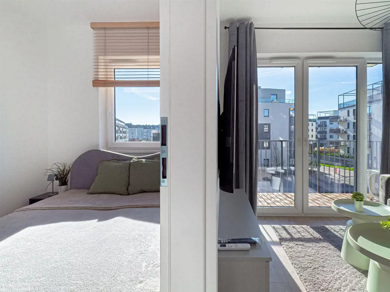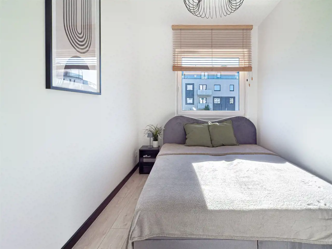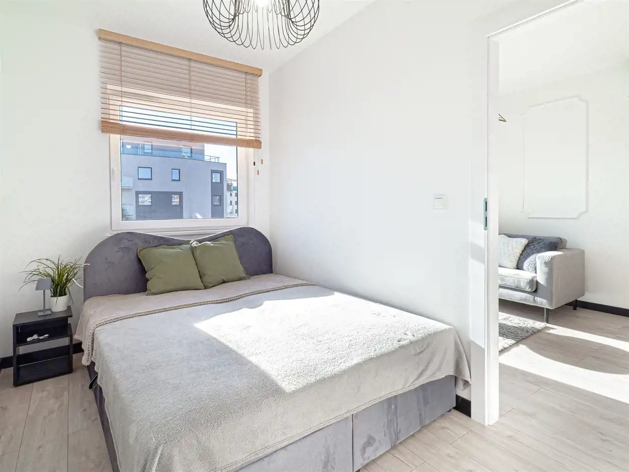 - przytulnej sypialni z łóżkiem podwójnym. Na oknach zamontowane rolety zewnętrzne.