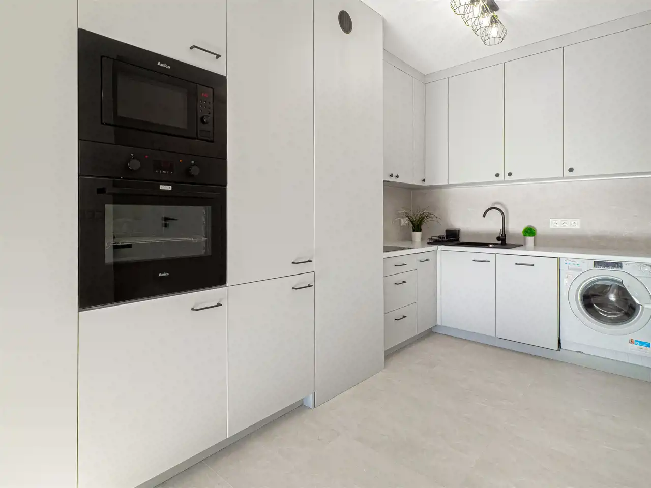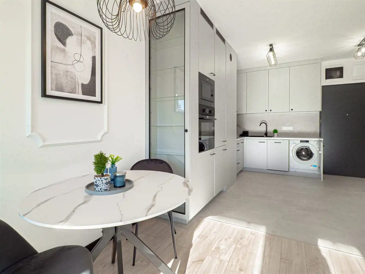 - aneksu kuchennego z dużą ilością szafek do przechowywania sprzętów kuchennych, na wyposażeniu również stolik z krzesłami. Aneks kuchenny wyposażony został we wszystkie niezbędne sprzęty AGD: lodówko-zamrażalkę w zabudowie, indukcję, piekarnik, zmywarkę. W aneksie również pralka.