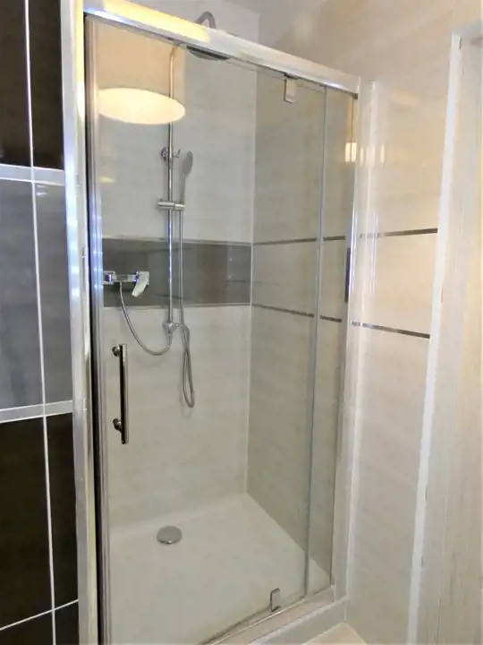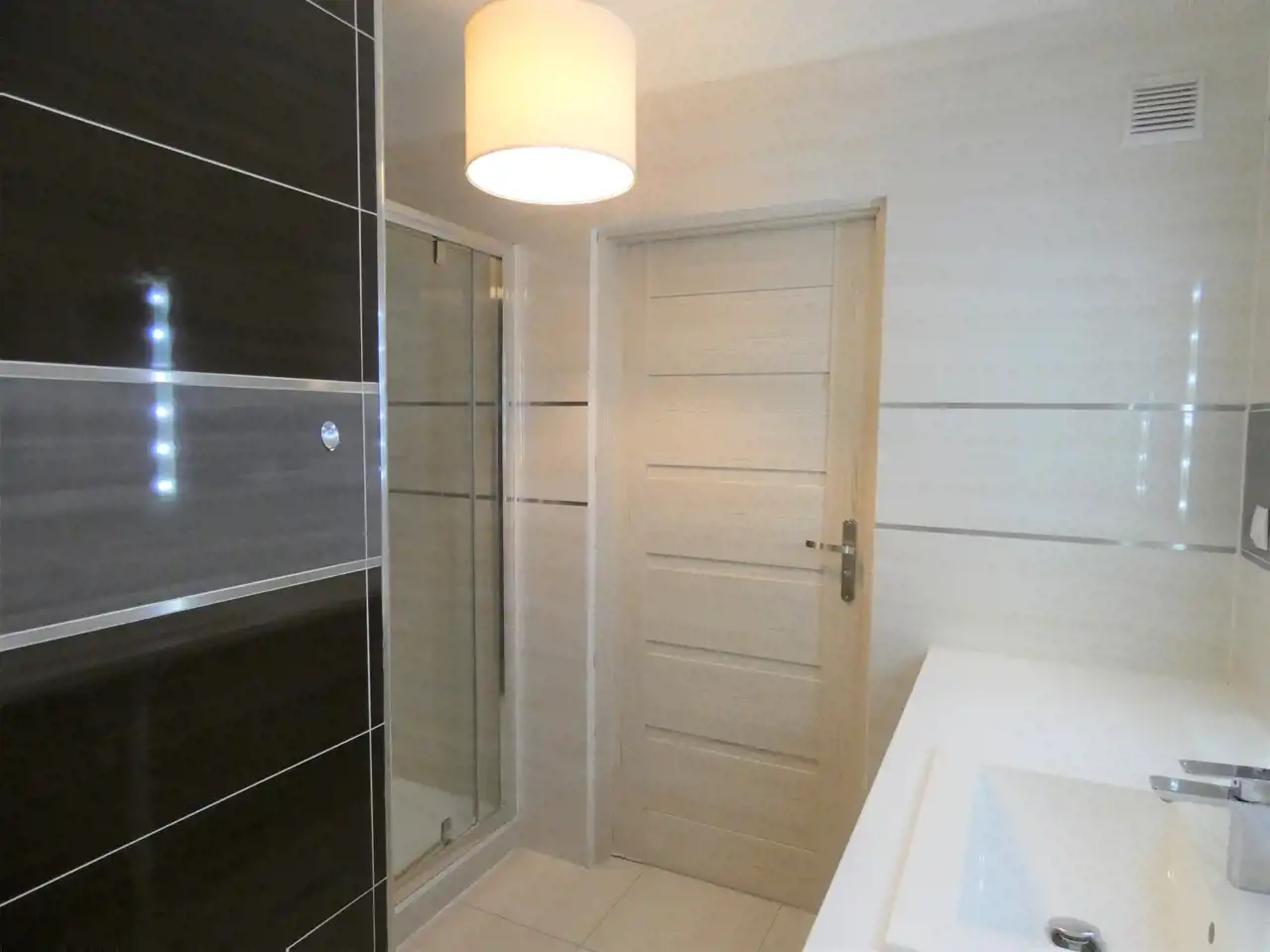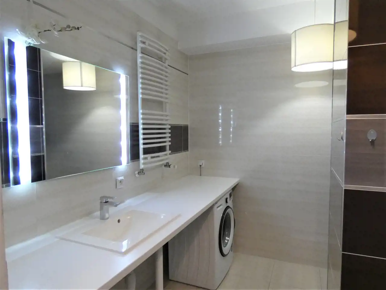 - Elegancka łazienka z kabiną prysznicową i pralką