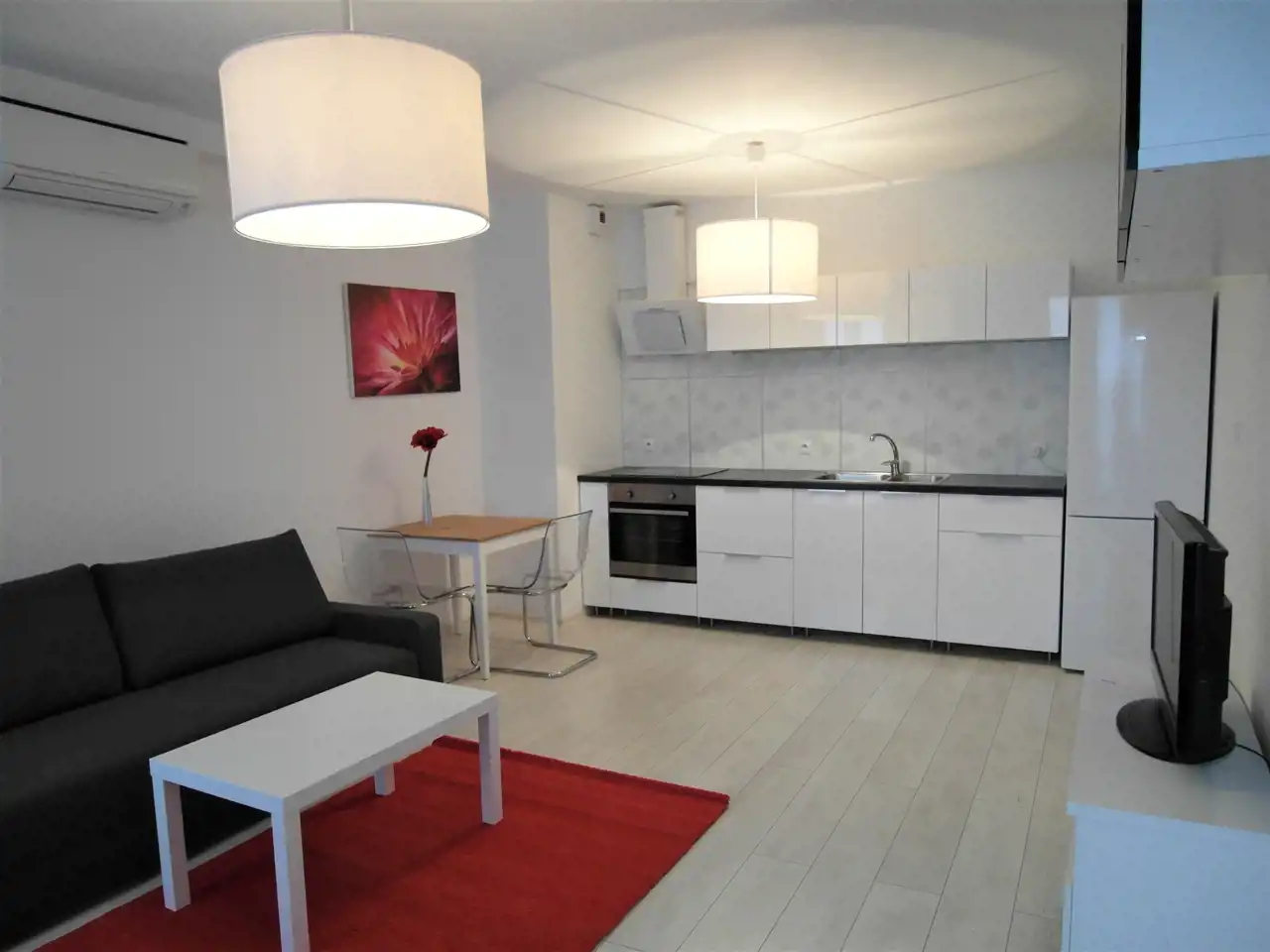 The kitchen is fully equipped and furnished, connected to the modern living room, which includes: