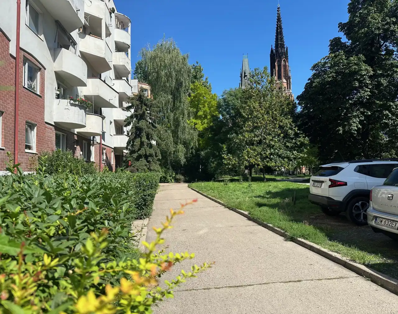 Miejsca parkingowe na ulicy pod budynkiem.