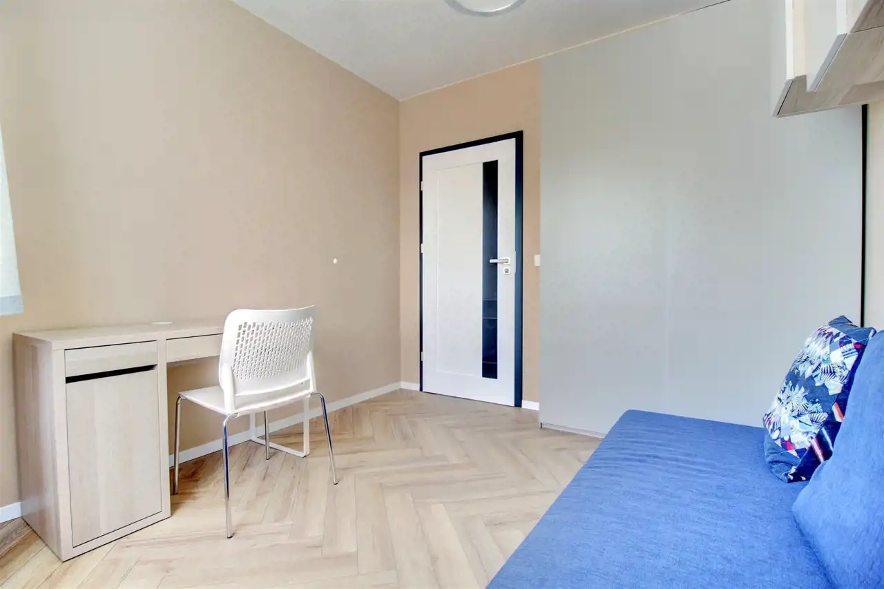 Nieruchomość składa się z salonu z aneksem kuchennym, sypialni, łazienki, przedpokoju oraz balkonu. Mieszkanie jest starannie wykończone, w pełni umeblowane i wyposażone w niezbędny sprzęt AGD.