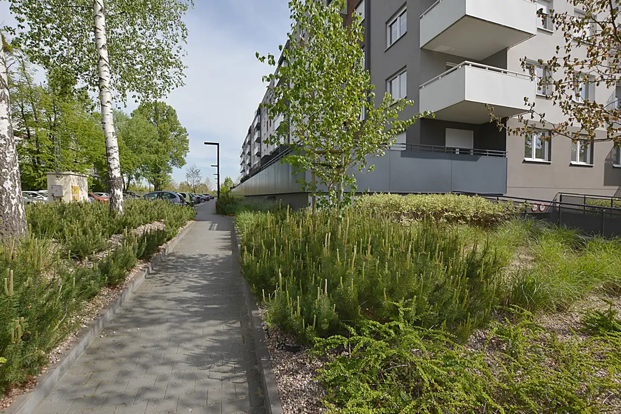 Nowe ładnie zagospodarowane osiedle.