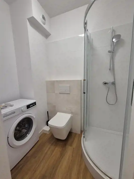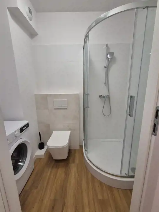 Łazienka z kabiną prysznicową w kaflach razem z w-c, wyposażona w pralkę.