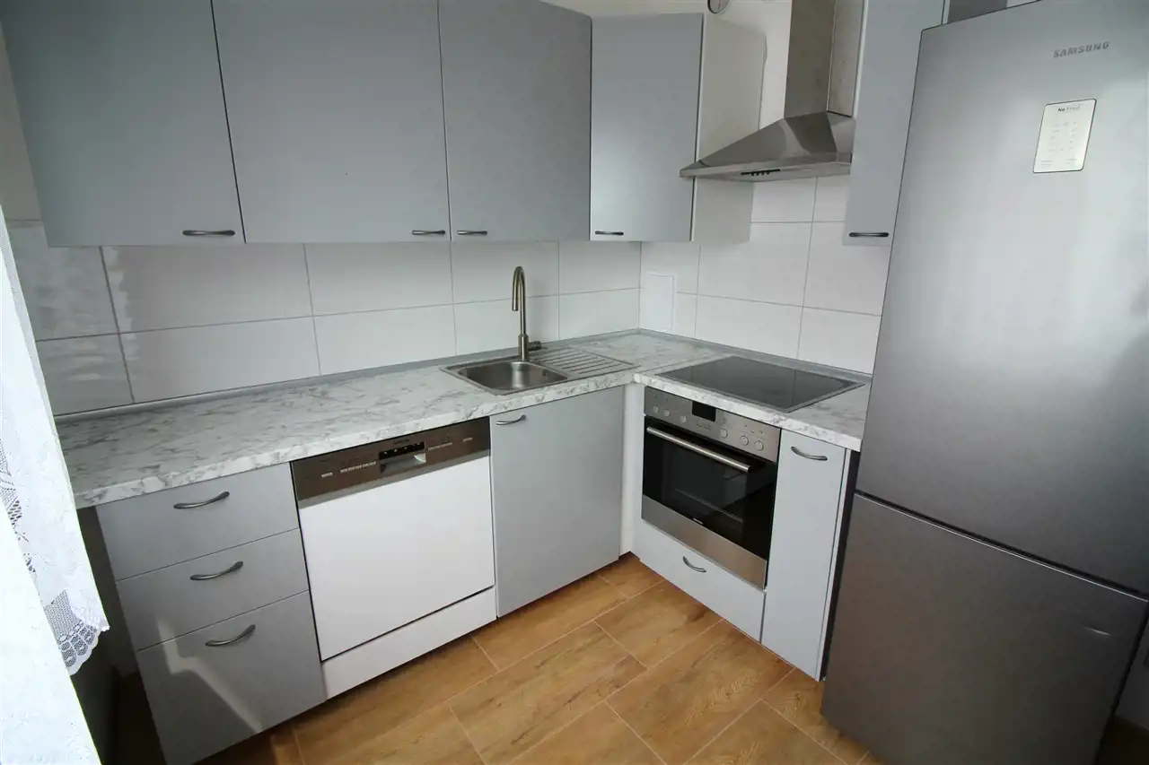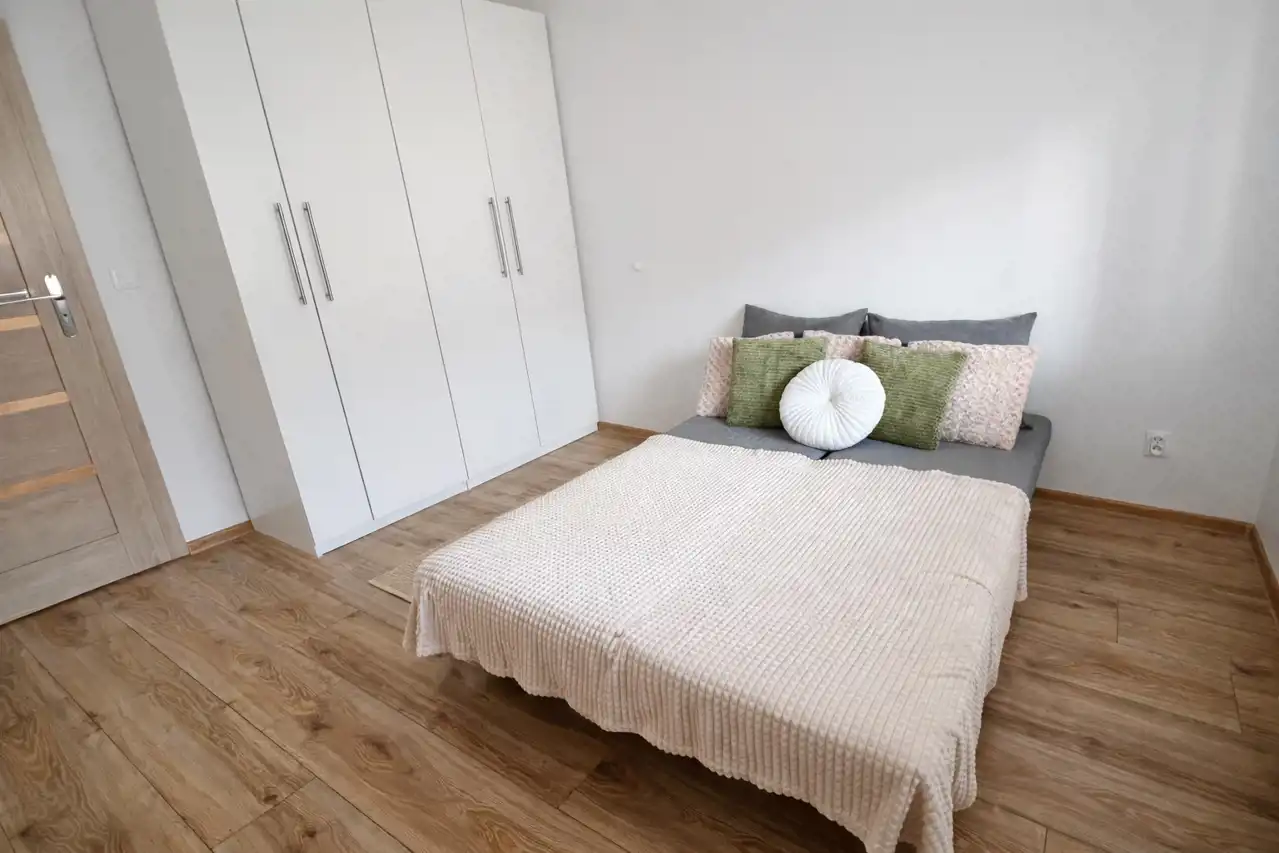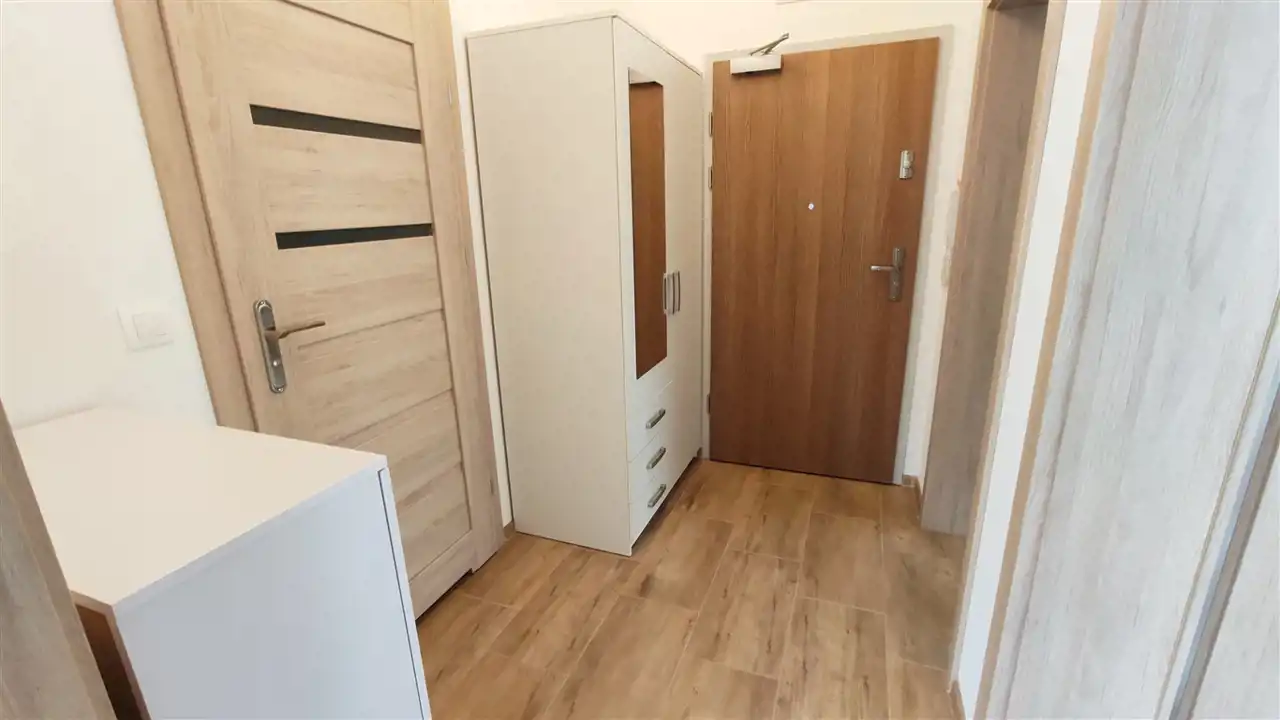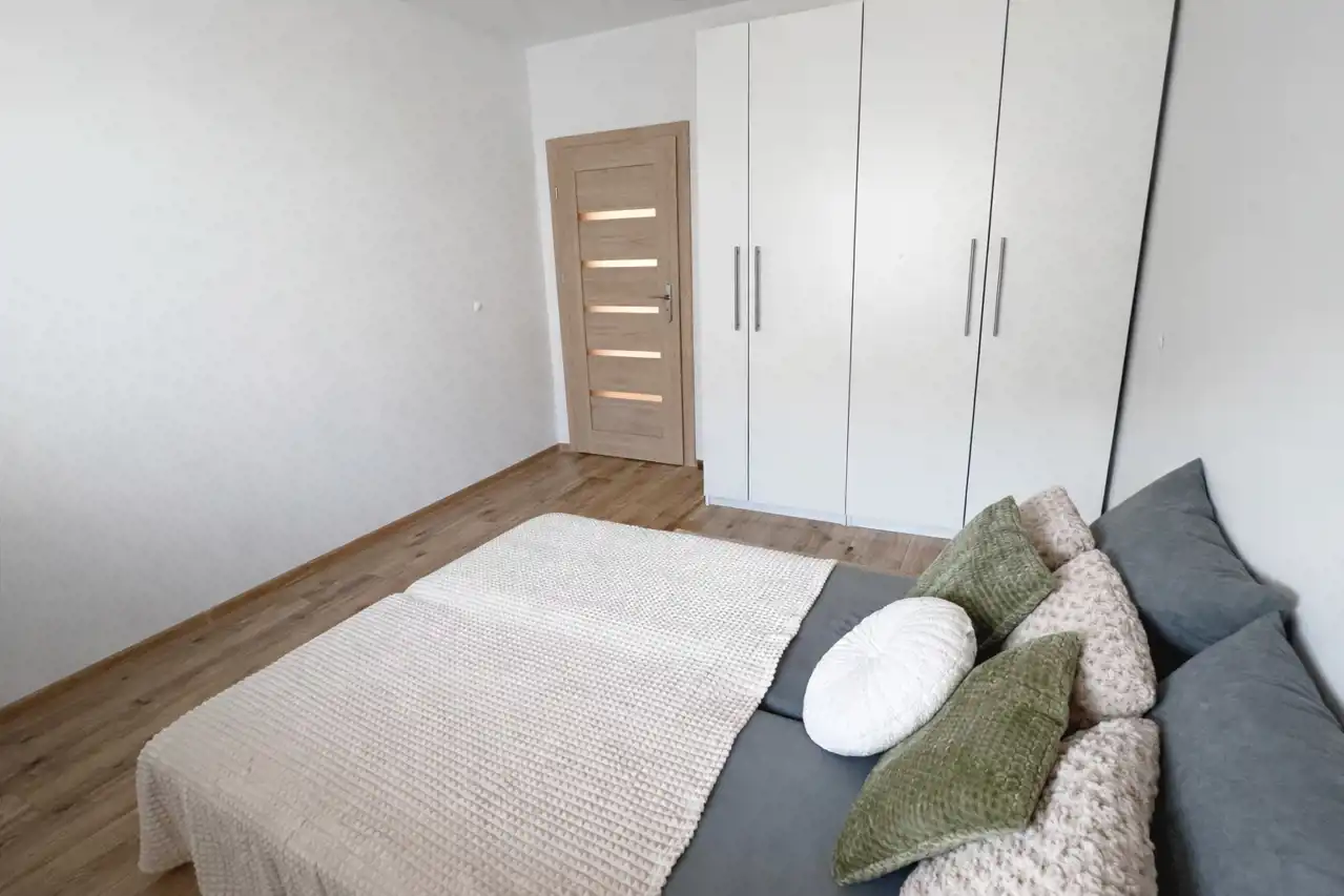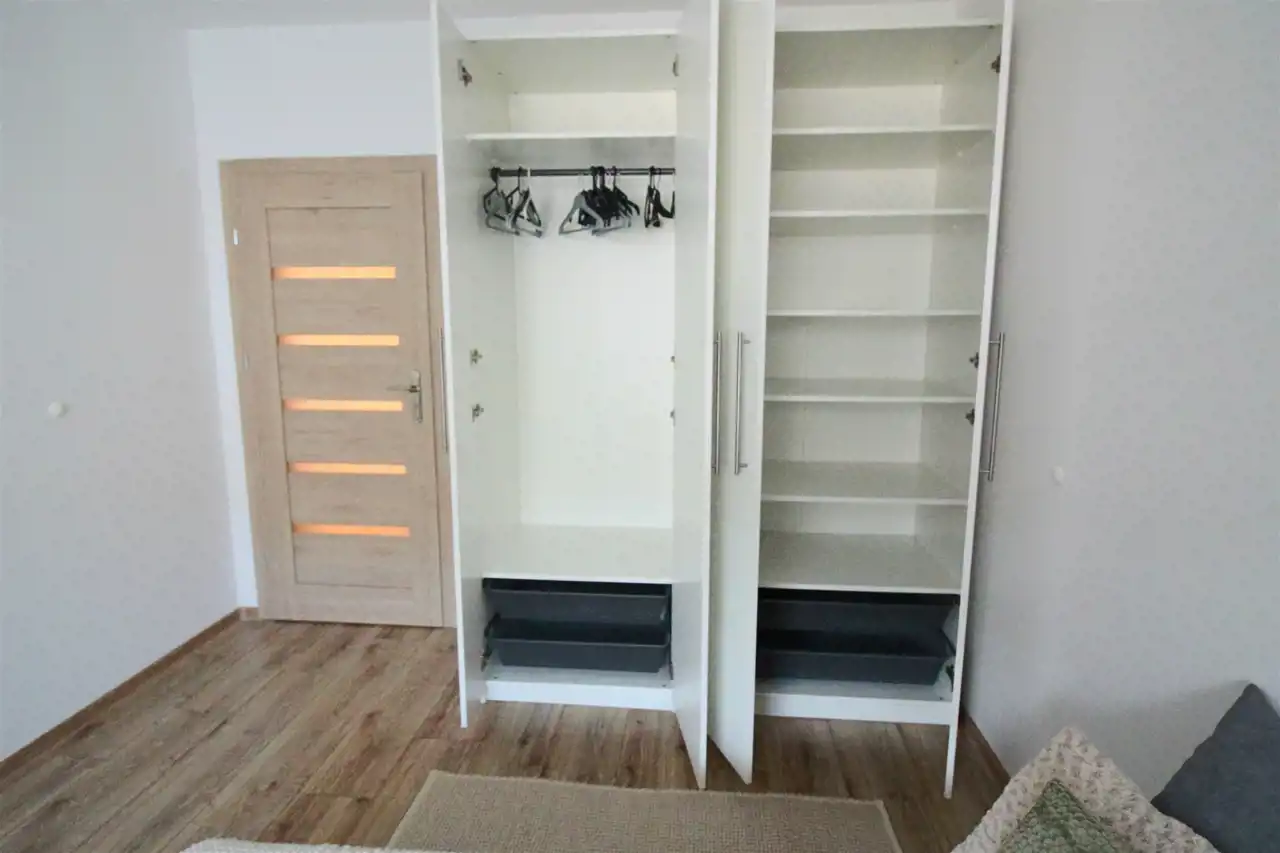 Mieszkanie jest w pełni wyposażone, umeblowane i gotowe do wprowadzenia. Kuchnia z meblami i sprzętem AGD (lodówka, piekarnik, płyta, zmywarka) oraz stołem z krzesłami. Dwa niezależne pokoje z rozkładanymi kanapami i meblami. Z większego pokoju wyjście na duży balkon. W przedpokoju dodatkowe miejsce do przechowywania rzeczy - wygodna szafa oraz komoda. Łazienka z prysznicem i pralką.