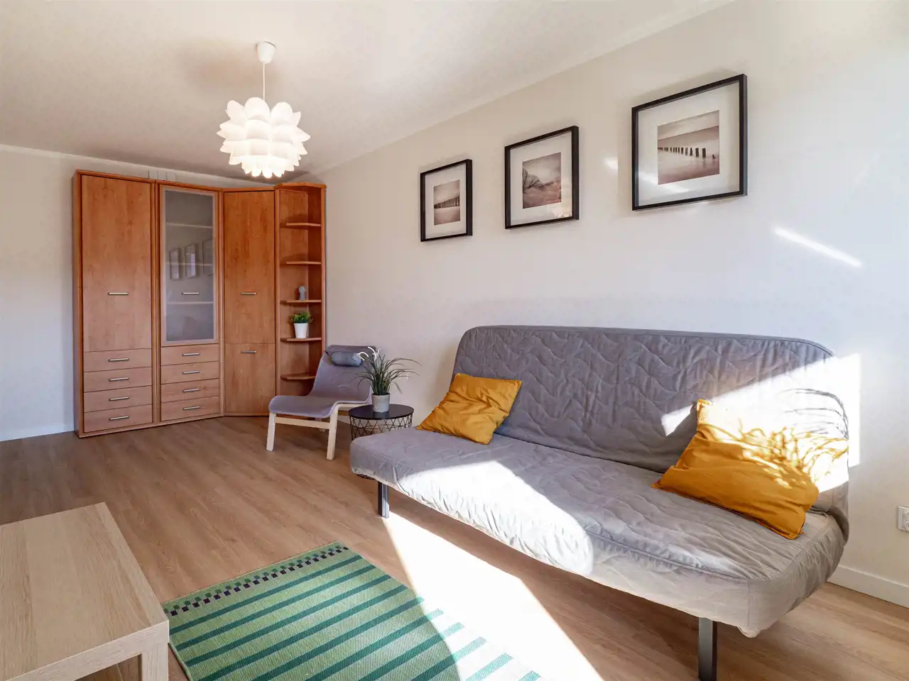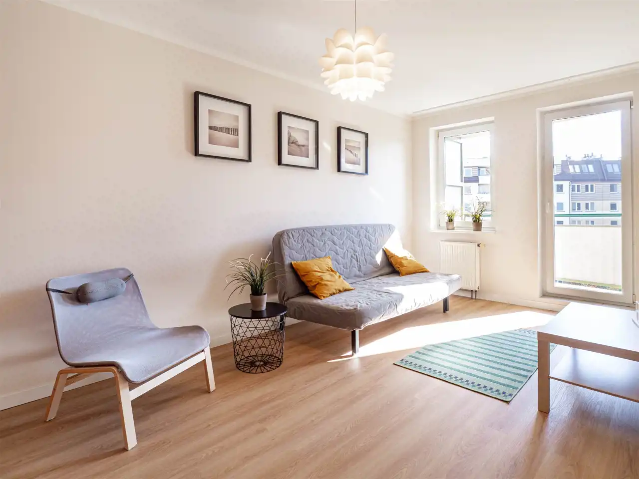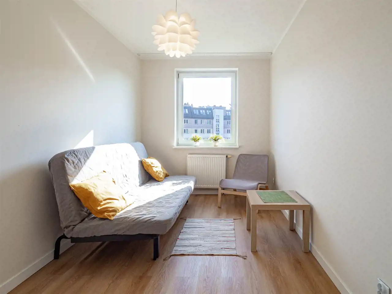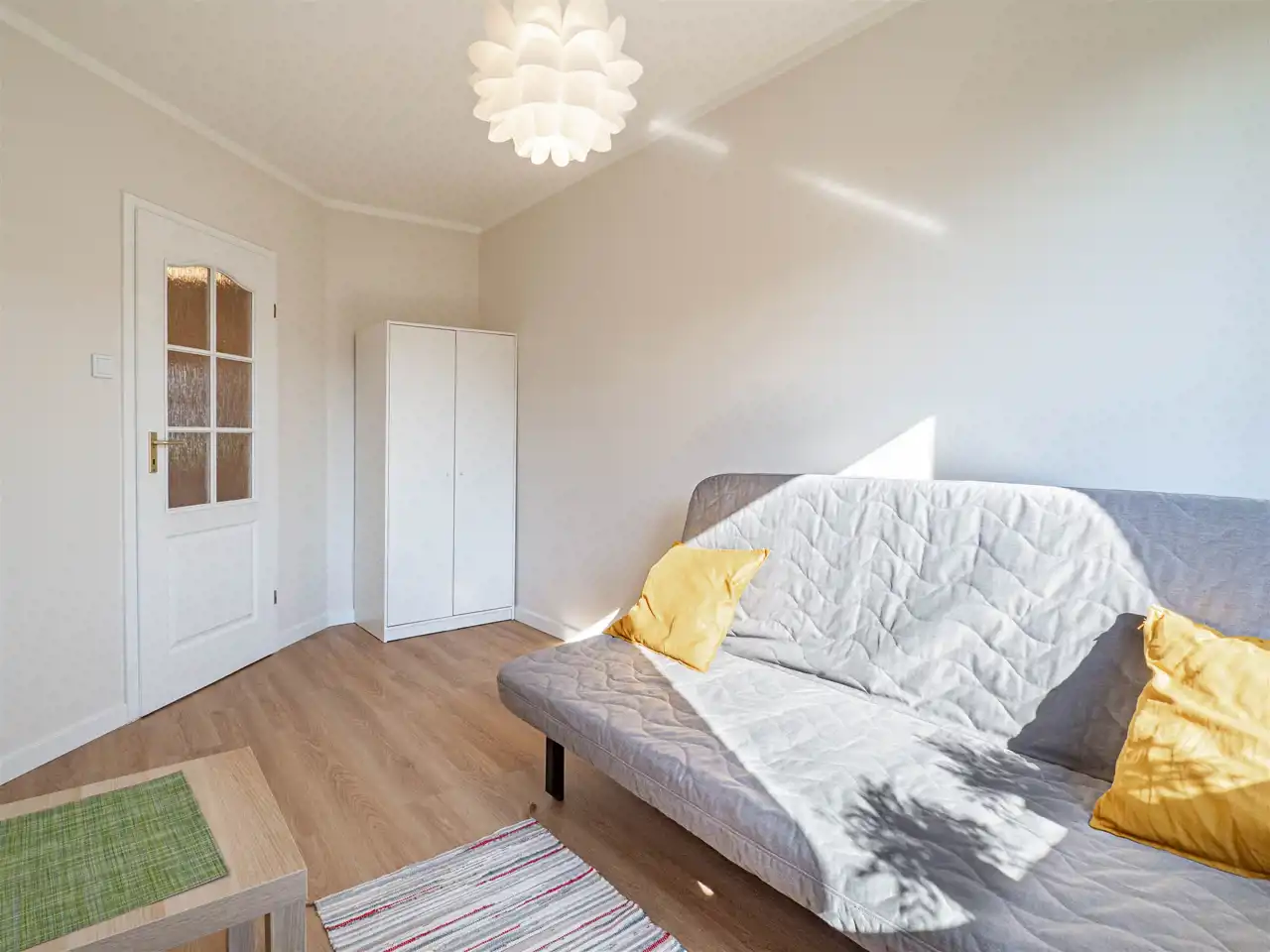 Mieszkanie znajduje się na 4 piętrze w budynku z windą. Jest w pełni umeblowane i wyposażone we wszystkie niezbędne sprzęty, gotowe do natychmiastowego zamieszkania. Dodatkowo, w mieszkaniu dostępne są udogodnienia takie jak odkurzacz, żelazko, deska do prasowania i suszarka do prania.