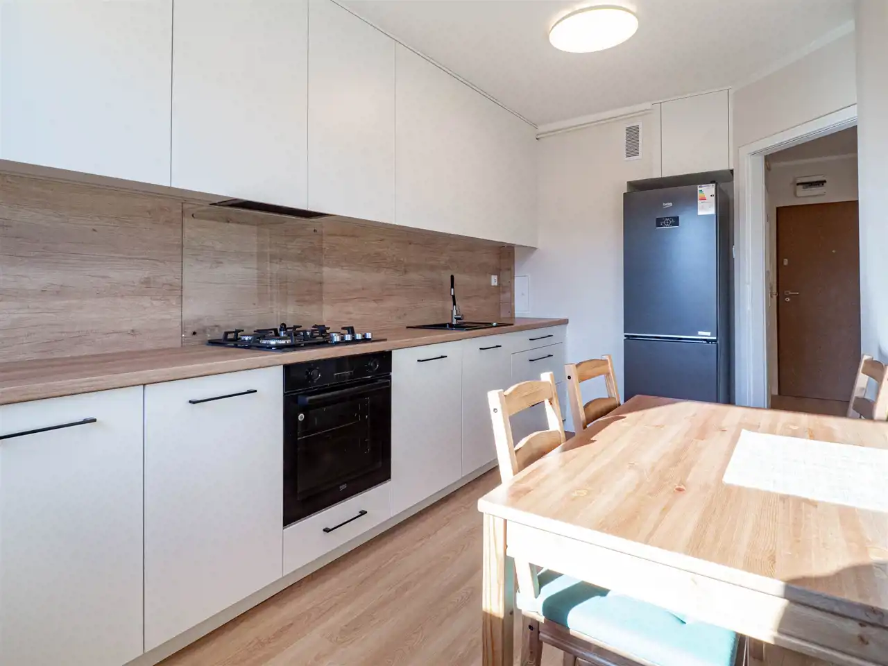 - Kuchnia: przestronna z pełnym wyposażeniem, z meblami w zabudowie, piekarnikiem, zmywarką, płytą kuchenną, okapem kuchennym, lodówką z zamrażarką oraz stołem dla czterech osób,