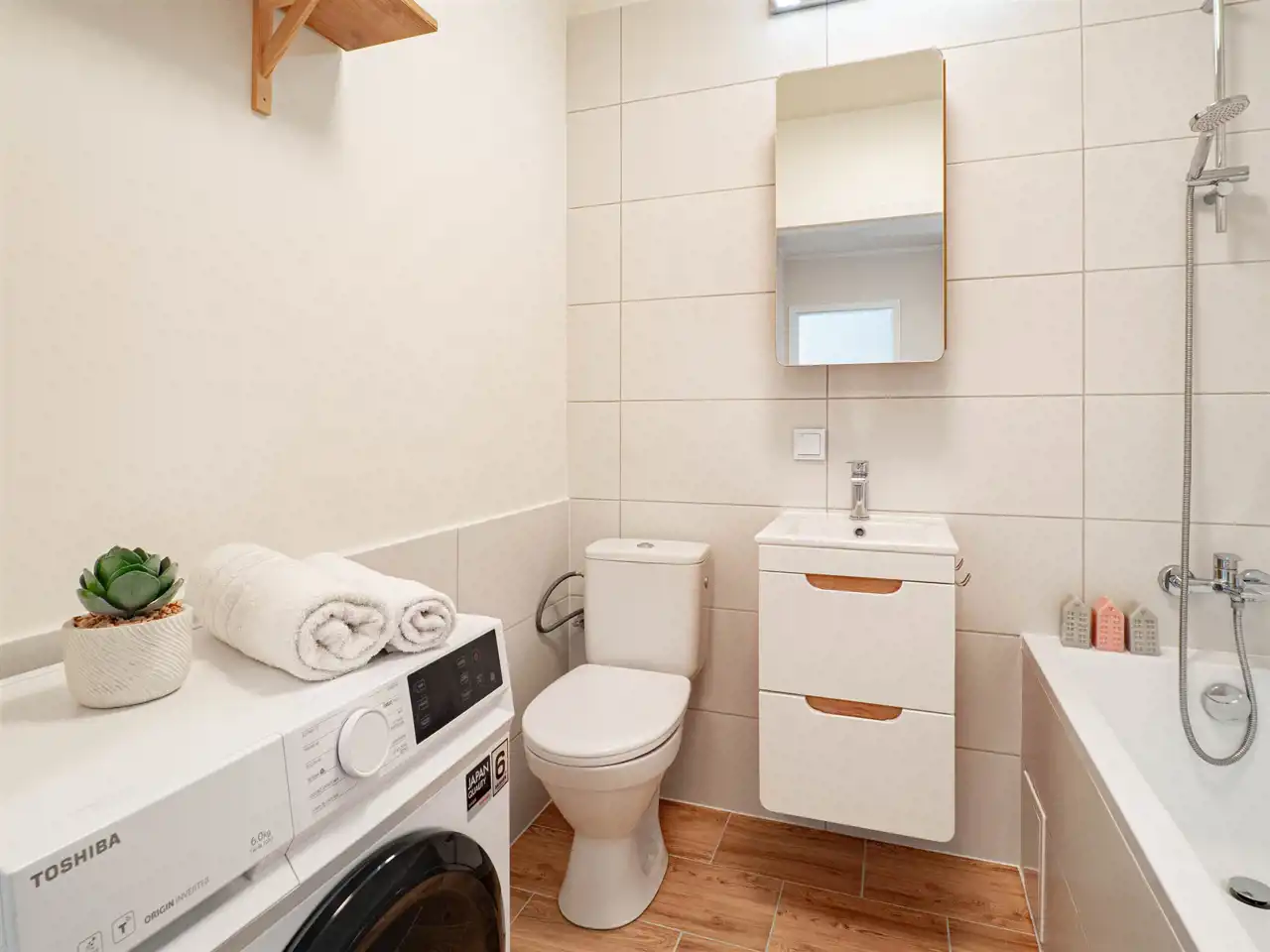 - Łazienka: funkcjonalna łazienka z WC, wanną, umywalką z szafką oraz oświetloną lustrzaną szafką. W łazience znajduje się także pralka,