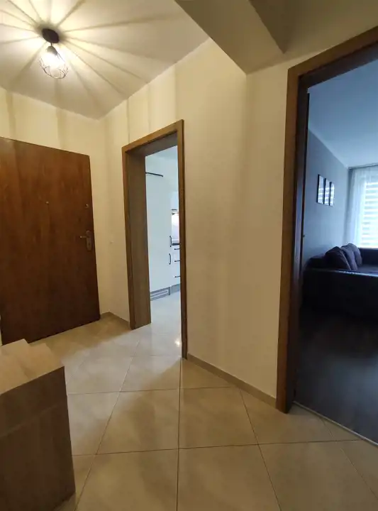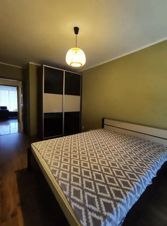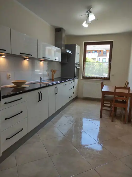 Składa się z dwóch pokoi (sypialni i pokoju dziennego), oddzielnej kuchni, łazienki, przedpokoju i balkonu. Kuchnia w pełni wyposażona: płyta ceramiczna, piekarnik, lodówka, zmywarka, okap, oraz naczynia i drobny sprzęt w kuchni.